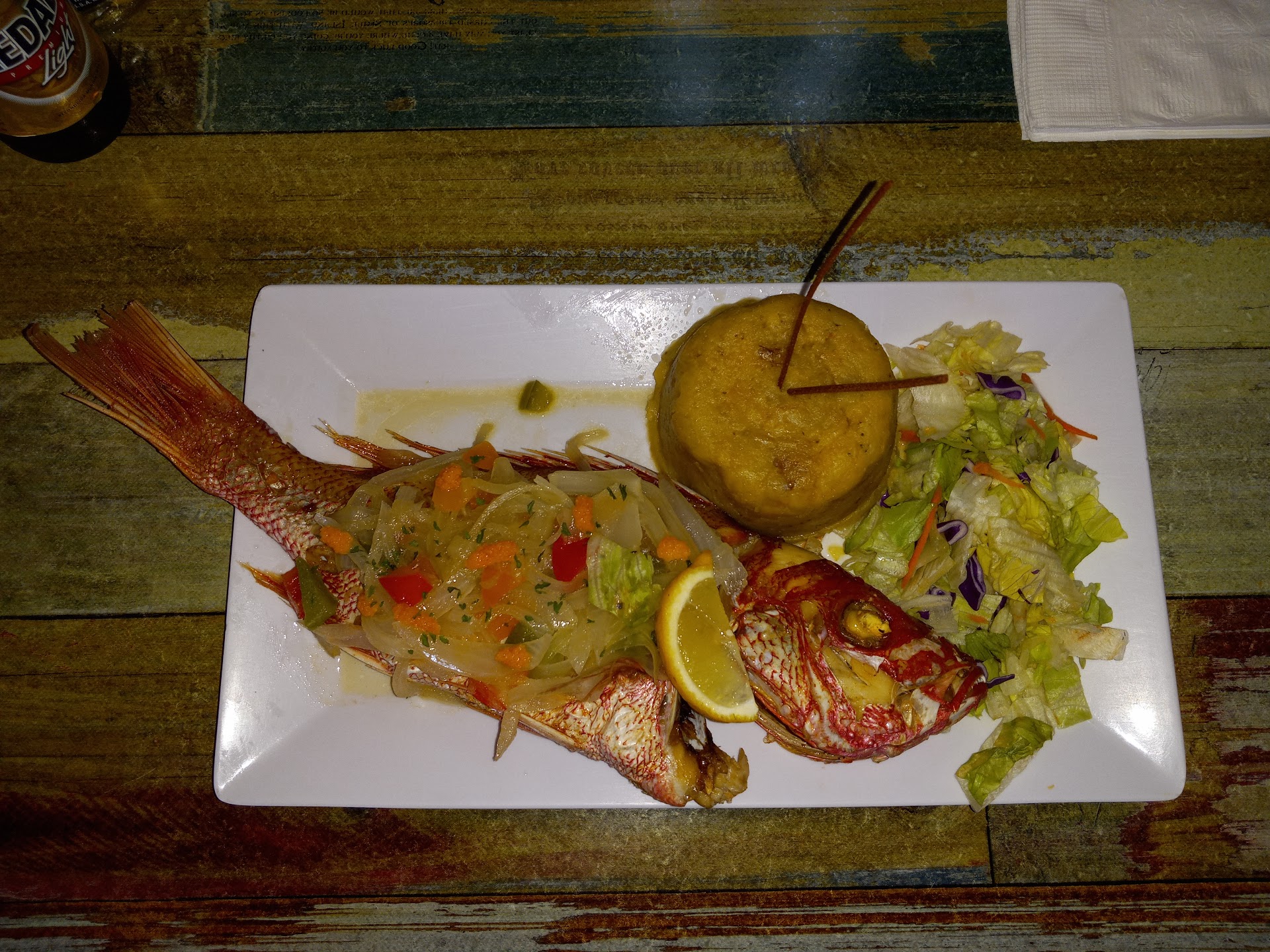 Read moreUnder construction so watch your step as you enter; definitely worth the trip. We arrived 2PM on a Friday and were greeted lovingly by Sara, our wonderful and attentive waitress; her service was excellent from start to finish (ask to sit in Sara's section for awesome service). We had the fried Red Snapper al Ajillo with Mofongo and it was excellent! We had a couple of Pastelillos de Chapín as appetizers and the dough was light, flaky and fried perfectly in fresh oil...excellent as well. As we finished around 3:30PM it began to fill up. I would swear the Red Snapper was within a day or maybe two of being caught; the taste and freshness of the fish was beyond compare. I hope you have a wonderful experience as well...ask for Sara as she made great recommendations....