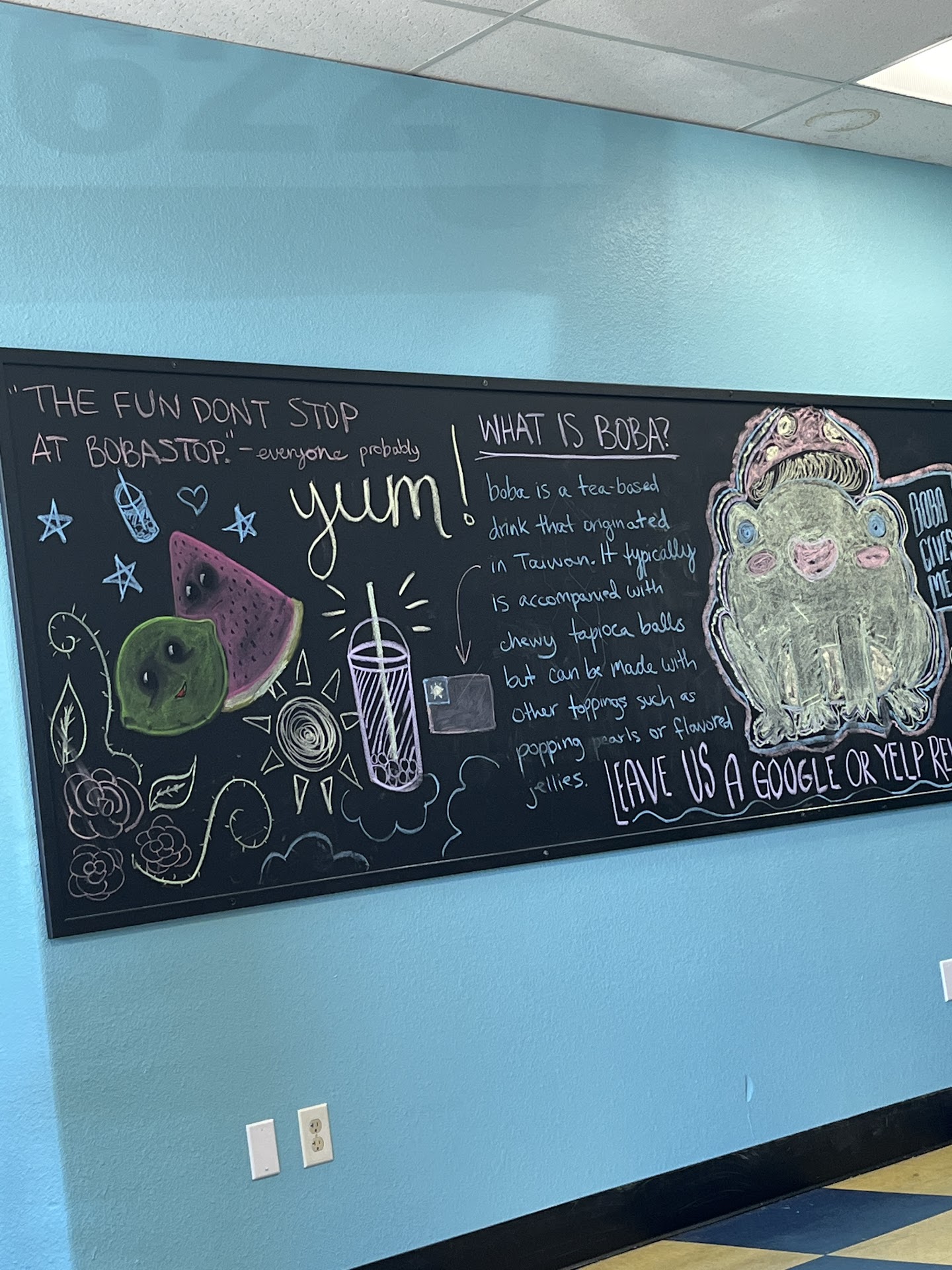 Read moreI am shocked at the service i got at BobaStop. The employees were absolutely amazing and so friendly! I was not expecting this. The drawings on the chalk board gave a whole new level on comfortability and safeness. I felt so welcomed that I stayed the whole day and just chatted with the workers. I don’t even feel like going home now. An amazing experience and they should expect to see me here again at opening. I am baffled at the quickness of service, considering I came in with a group of friends. The cleanliness of the store was unbelievably amazing and tots unexpected. One thing that was kinda unsettling was the lime and watermelon drawing. although it is still absolutely precious, still a little terrifying. Last note is the hard working workers here, so amazing! Anyways i gotta get to bed so i can be here for...