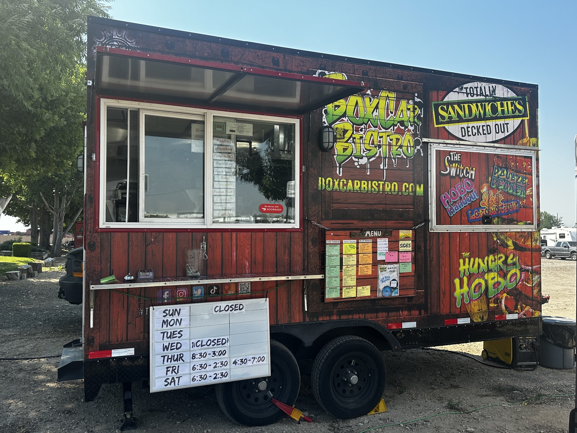 ย ย ย Read more๐ BoxCar Bistro!!!! We were looking for breakfast food and the grilled cheese ๐ฅช & breakfast ๐ณ options drove us to drive by. Great place for breakfast or a tasty sandwich made fresh. The owners Jen is super friendly and was so wonderful to explain the options. Which there are many. She has 4-5 cheeses ๐ง plus the normal meal/deli choices and several breads plus a croissant (for $1 more). She is hardworking and tried to get our custom order of 4 out in 15-20min (itโs NOT a drive through so if you are pressed for time itโs not going to work)... It did give us a moment to sit and relax (tenet and chairs are adjacent to the food truck). She has 6-7 sauces available and great flavors to choose from. Breakfast can run you about $6-8 and sandwiches are more around $14-17 (please see picture of menu for specific sandwiches). Note: Google doesnโt tell you which side (left or right on the street; itโs just in the middle)โฆ but itโs directly across the street (opposite side) from โAmerican Construction...