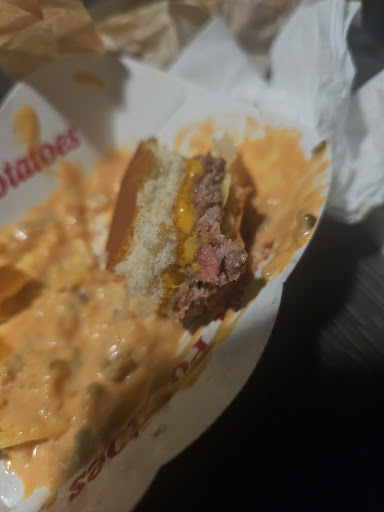 The food: I ordered a cheese burger combo with animal fries. Animal fries just have sauce and cheese on them. The burger looked exactly like all the pictures of a perfect burger in the ads. Most places hand over something unlike their pictures, smashed down etc. Think how it would look if you made it at home with fresh ingredients. It was a little too salty for my taste however. The fries. Well let's just say, once I got past the sauce to the non sauced fries were, I was very disappointed. The texture was off (like cardboard) and they had no flavor. Are they even actual potatoes? McDonald's fries are the worst in my opinion, and these were worse then those.