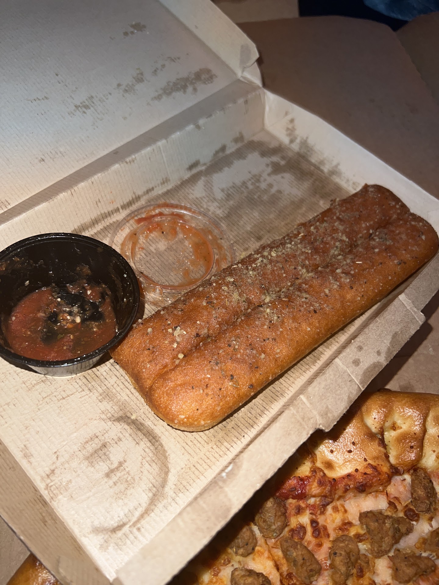 For the longest time, I have been 100% Pizza Hut! Since High School! I haven't had their pizza in a long time. Since the pandemic, money is tight. It's hard enough to roll out of a drive through line, with the correct items ordered. I was sick and in need of some food. So I sprung $25 for a One-Topping-Stuffed Crust Large pizza, some breadsticks and I also added extra marinara sauce. Simply because when one is wanting some delicious warm sauce and cheese filled pizza and some delicious breadsticks, what is not to stop them? I completed my Online order, tabbed into getting Text alerts regarding my order. The order was placed at 4:45pm with a guarantee of 35-45 min delivery. Not only was I never notified of the "tracking", I waited an hr and 15 mins later to call and find out what the delay was. I work in the field of food delivery. I understand there are issues and/or complications during any transactions, but these delivery drivers work solely for this company. The delivery came and upon discovery, I found the essentials, even being a $0.70 marinara sauce, to complete the experience, was missing. The food was COLD, the breadsticks were over cooked and there was absolutely NO sauce in the pizza! See pix! I have completed the survey, made an online complaint and called Customer service! All which will do nothing for me. This is such an extreme example of how those who are suppose to be there for "us", and be the reason to believe this world isn't crumbling before us, that regardless, no one seems to care and I haven't seen one thing done to fix the situation. For the future, I hope your experience is far better than mine, yet I will no longer put my hard earned money into a corporation which can't even follow through with the most simple job they have, which is to make good quality products, deliver them on time and take accountability for their misstates and create solutions for them! Soon, only time will tell, if a true business will defy the doubt...