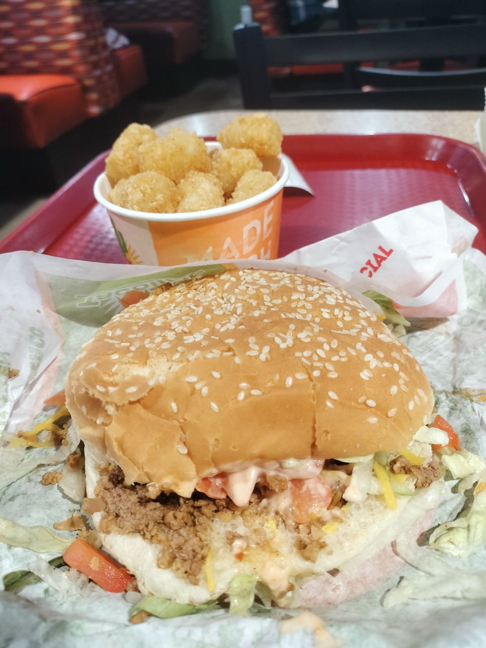 I ordered a crisp meat burrito and a side of stuffed tots and realized it would be about the same price to change the burrito to a meal and I'd get a drink and extra tots. I had it switched and then waited roughly ten minutes in the restaurant (no drive through at this location). There were two tables dining in and a guy that said 6 bucks for three soft tacos as well as a group of teenagers. Everyone got their order before me. When I got mine, they didn't understand the ticket and forgot the tots so I had to wait a little longer.