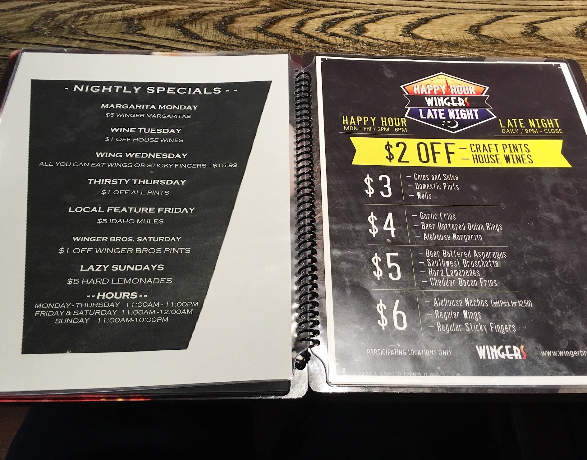 We came here on a Wednesday night, only a few cars in the parking lot. Unlike my recent visit to TGI Fridays (which is right across the parking lot of Wingers), the empty parking lot here had absolutely no correlation to the food, service, or atmosphere. In short, we had a fantastic time here, and I truly do recommend this place, ESPECIALLY during happy hour (M-F 3PM to 6 PM AND Daily 9 PM to close).