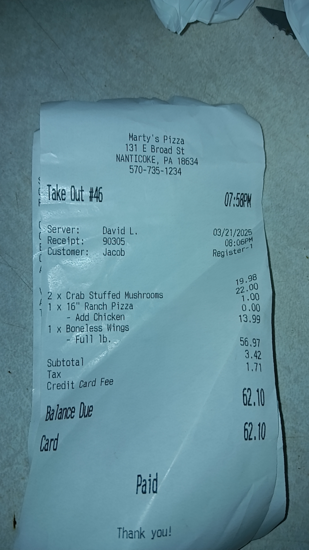 Read moreWe ordered out so we didn't get to deal with much of the service. It's Friday night and I know that means it's crunch time in a restaurant I've worked in MANY before. We ordered 4 things technically 3. We decided on 2 crab stuffed mushrooms, that tasted like there crab has been sitting out for a week, a chicken bacon ranch pizza with broccoli, which wasn't bad for the free extra toppings we didn't ask for like a couple uncooked onions and half backed tomatoes but I guess they were used becuase they ran out of baconor something, and mild wing bites, that were just a bit dry. Crab stuffed mushrooms should not be almost 10 bucks when your getting something like that back. We've been here not that long ago and raved about the food. I really hope you didn't get a new chef, and we were very...