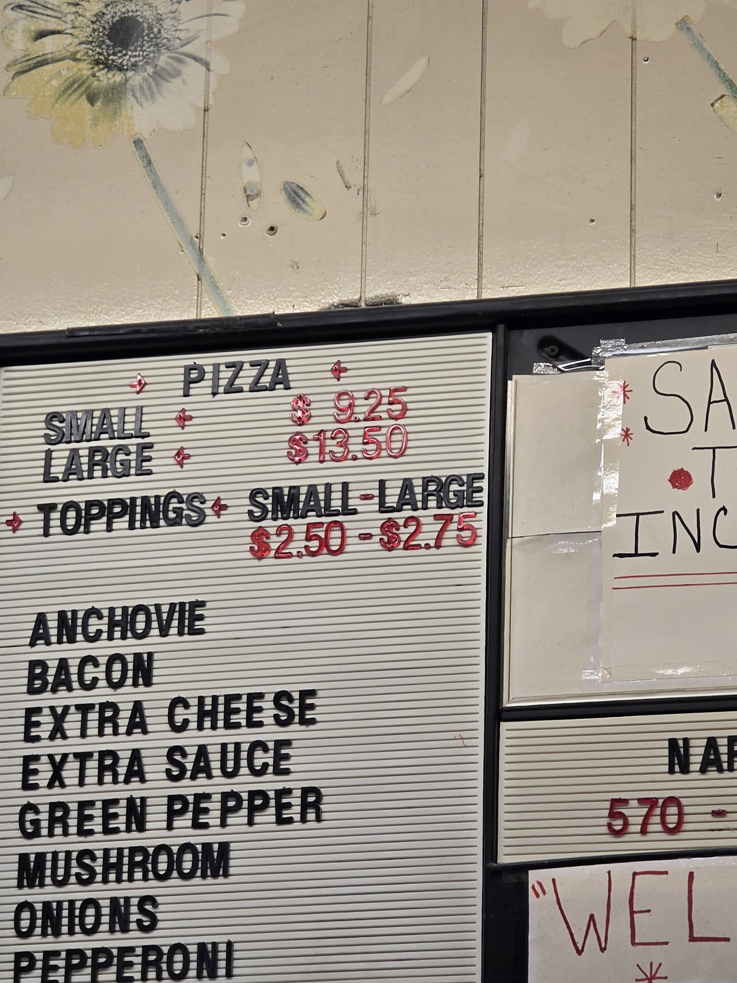 Read moreIt's the best pizza in the nanticoke area of luzerne county have been eating it since I was a young child it has that old school pizza place feel walk in old school tables and chairs. Look at the menu made from the ones you place the letters in still. It only accepts cash is the only down fall in my opinion but that some adds to it's original character. Has a sweet sauce but not too sweet and just the right amount of cheese. They put their own boxes together still and they only make pizza perogies and potatoes pancakes on certain days they will be retiring soon so get your dose of it in now for the next couple years. It's a great family owned friendly business to enjoy a nice tray of bacon and cheese pizza without being...