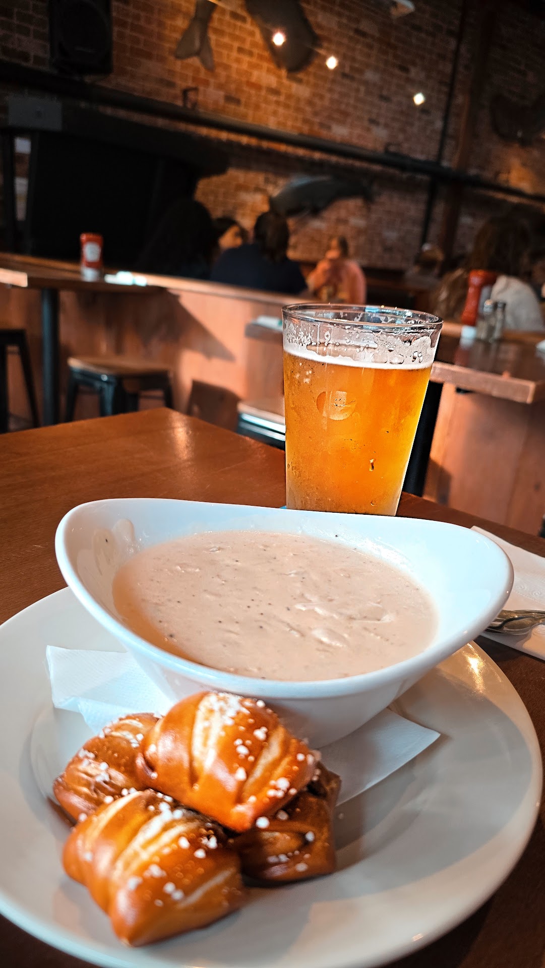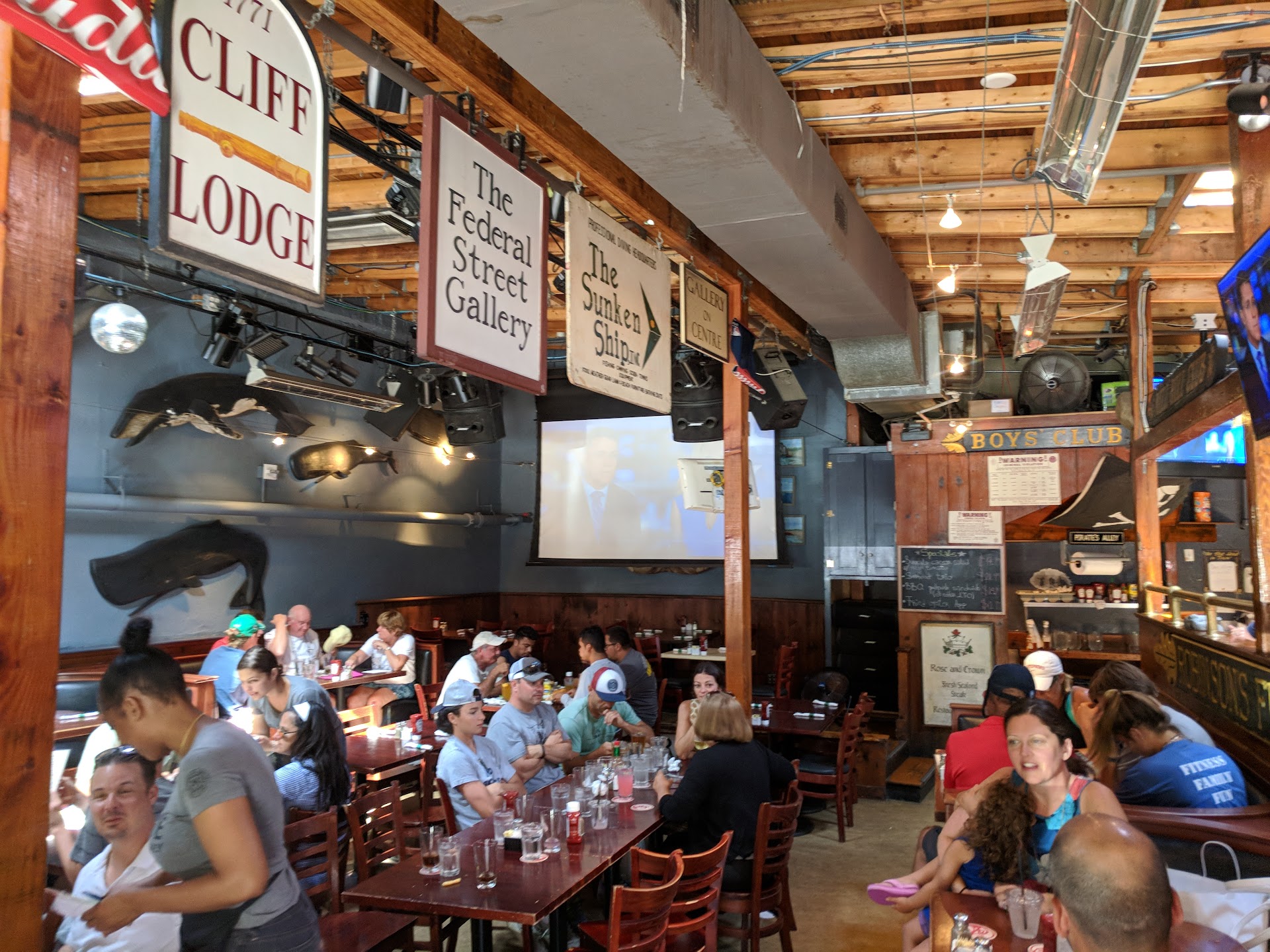 Very comfortable and friendly vibe at this sports pub. We arrived for a late lunch (when other nearby restaurants had already closed) and enjoyed our meal and the atmosphere at this great place. The food was not inexpensive ( meals for four and two drinks were about $100), but definitely worth the price, I'd definitely return for another meal here. One of the great bonuses was our super friendly waiter who took time to chat with us about Nantucket and answered all our menu questions. Also he checked on us repeatedly during our meal and made sure we had no unmet needs. The staff had no problems with our special orders and the food was delicious. I enjoyed the multiple options for watching sports (one large screen projection and several large TVs), as the World Cup was on while we ate. This is a great place for groups and families, although it was loud, it was still easy to hold a conversation. The restrooms were clean and well kept up. There is a separate bar area where you can just have drinks if you don't want to...