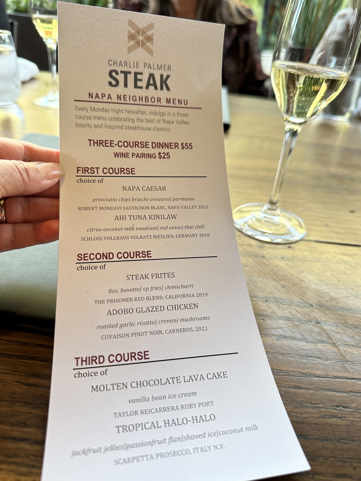 I would recommend this restaurant because of food and atmosphere. It was beautiful and the food was lovely. If you don’t need anything specific, it’s perfect. We were sat at a nice big table that was nicely decorated. The Napa neighborhood menu was soooo good. Very impressed with the variety and price.