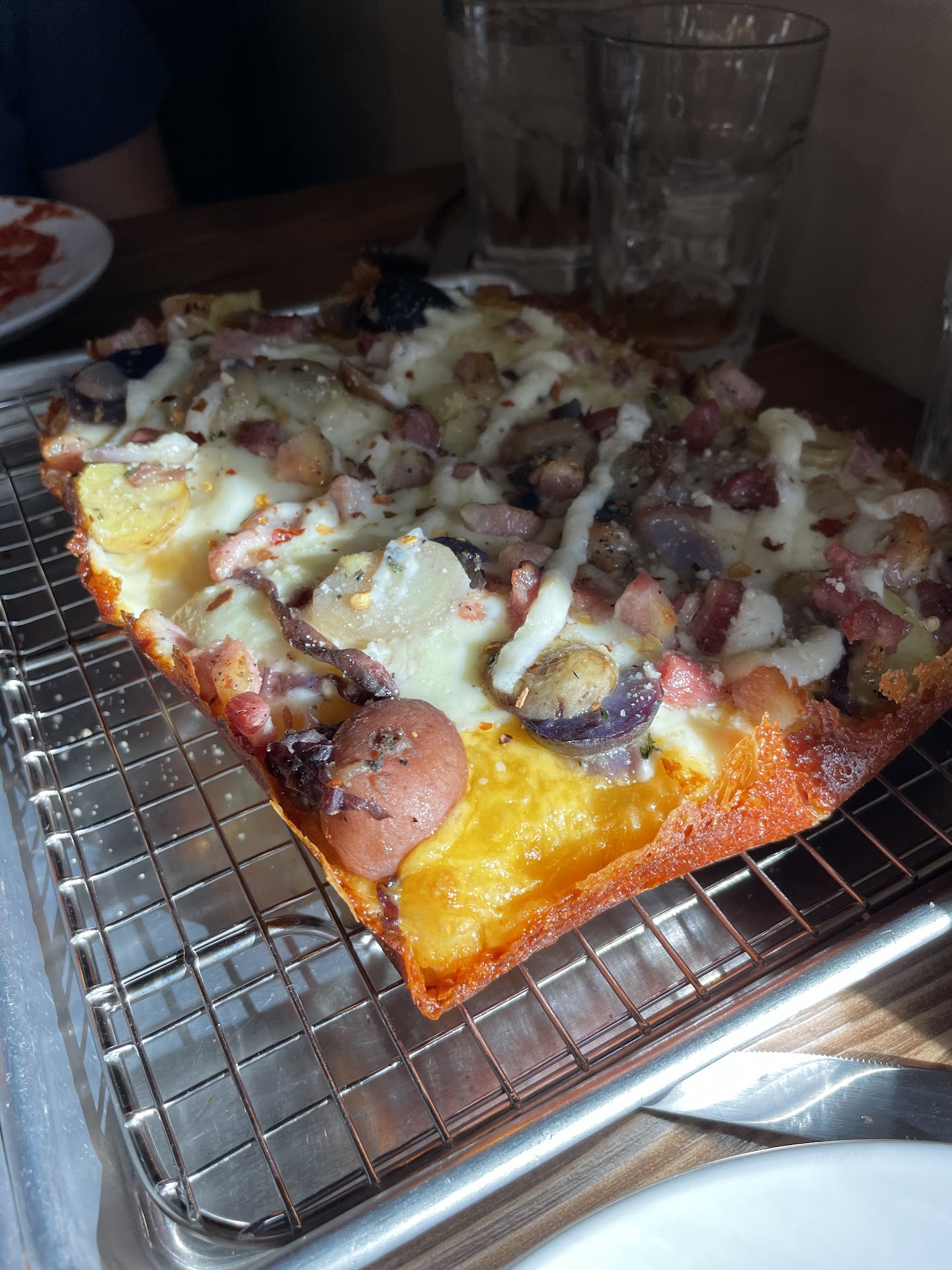 We had the garlic knots, the Detroit Style Roasted Potato and Pancetta Pizza, and the Detroit Style Croccante Pizza.