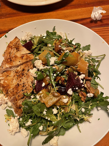I can only vouch for my beet salad because I didn't taste my friend's apple salad. Her salad looked good and she said it was super delicious! My beet salad was fresh, and plentiful. It could use more beets but otherwise very tasty. My chicken though was a little dry, maybe because it was cut on the thin side.