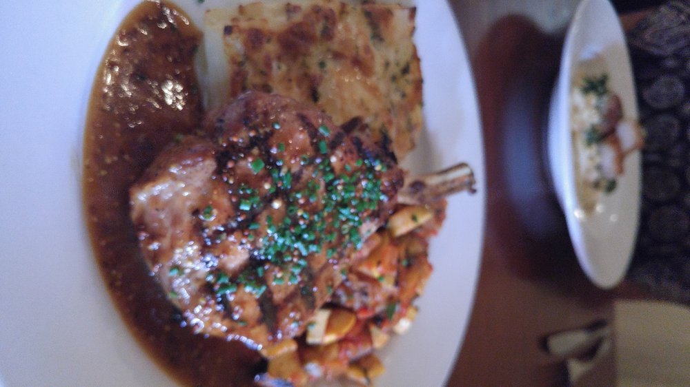 The restaurant is pretty small but has a decent sized patio. We chose to dine inside. The menu is pretty decently varied and I was having trouble deciding between a few dishes. Unfortunately a few of the dishes that sounded good to me had mushrooms and I HATE mushrooms. The Cabernet braised short rib risotto sounded awesome but there's mushrooms in the Cabernet reduction as well as a "trio of mushrooms". Bummer. There was a special that I can't remember but it also had mushrooms so I was thinking about the Grilled Pork Chop with scalloped potatoes and grilled vegetable ratatouille. I asked the waiter a couple of questions and noticed and elderly lady at the table behind us flailing her arms around trying to get someone's attention. I wasn't sure if she was gesturing to the waiter or me. I look at her and she mouths, "Pork Chop" to me. She says she had the Pork Chop last week and it was great. Guess she's a local. So instead of trying to modify an existing dish without mushrooms I decided to go with the woman's recommendation.