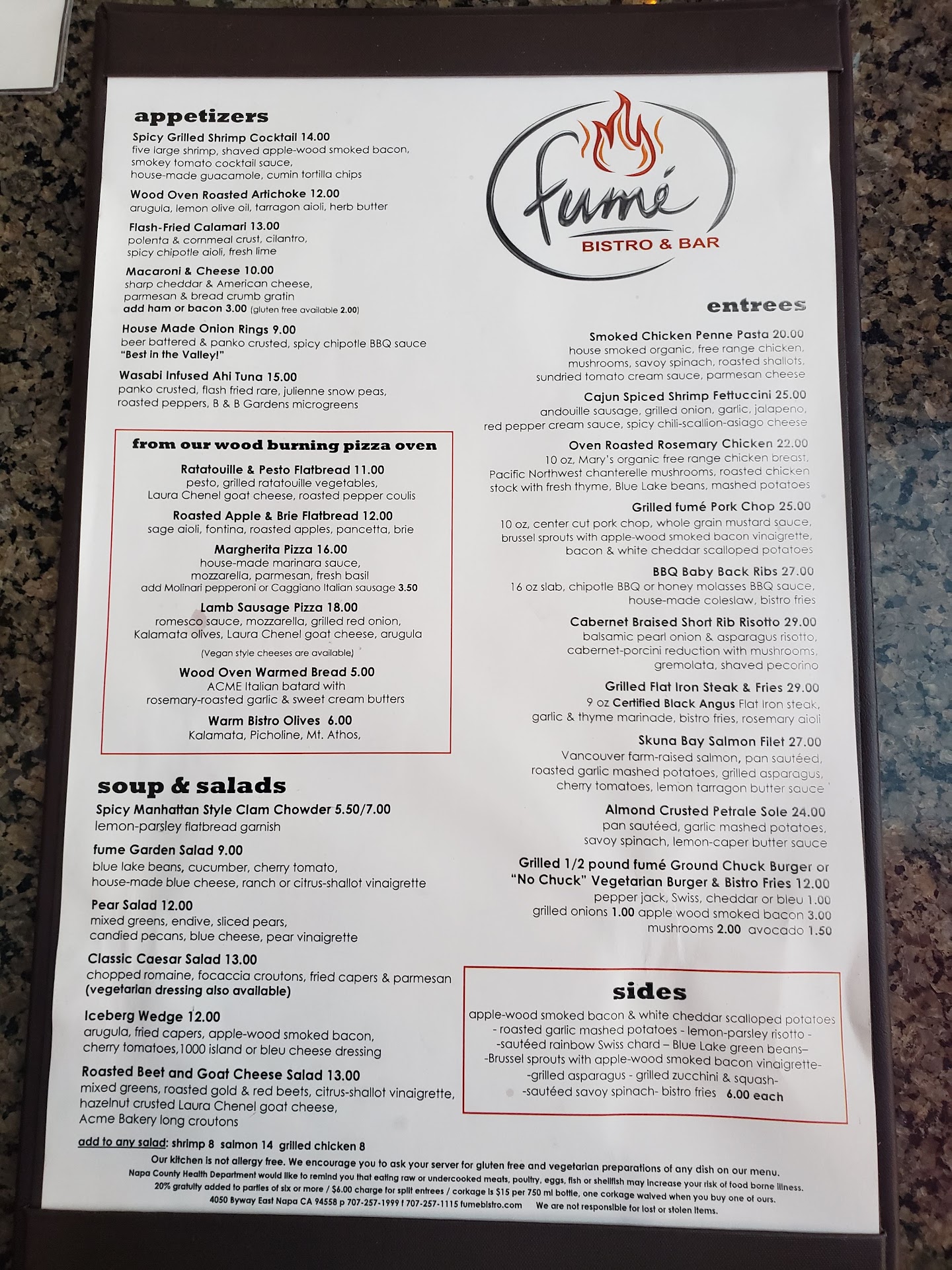 Read moreLooks are deceiving! My sisters and I were originally expecting to have lunch at a ritzy, high class, resturant in Napa , but the wait was 2 hours as we didn’t have a reservation. We found Fume by searching the web and we are so glad we did!!!! The outside of the Resturant looks a little rundown but the inside is very nice! A wonderful surprise. The food, service and atmosphere is superb, friendly, and classy. Our server was Laurie, who was fabulous and knowledgeable about every item on the menu and the specials. Jessica, our hostess, was pleasant and didn’t hesitate to help us when we requested extra napkins, spoons, and to move the umbrella to block out the sun . One of my sisters has a cast on one leg and is using a wheelchair. Jessica noticed me trying to get the wheelchair into the bathroom and came right over to move some high chairs so we could get in more easily. The food was outstanding! We had the Cesar chicken salad pizza and it was tasty….. could have used a little more chicken on it though. Next time I’ll request that. We also had the squash soup, and a salad with apples and chicken in it. All was very, very, good and nicely plated. Fume is located in a residential neighborhood. There is parking in their paved parking lot and also on the street. They have indoor and outdoor patio seating . We sat on the patio but I noticed indoor seating is so pretty and very cozy. We have found a new Resturant to add to my favorites restaurants. Please visit. You’ll be...