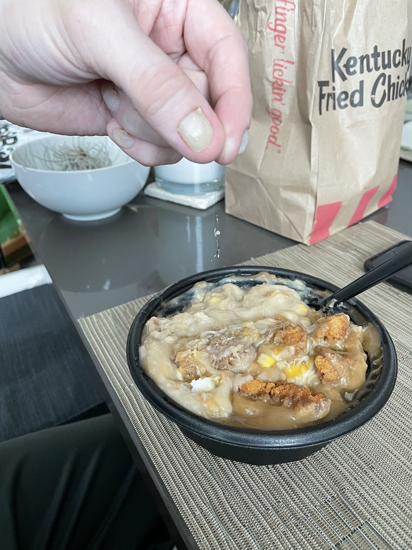 Ā Ā Ā Read moreI decided to get a Famous Bowl at KFC instead of grocery shopping and making a home cooked meal. It was a terrible idea because I ate several bites of it before I discovered this clump of hair inside the gravy and potatoes.