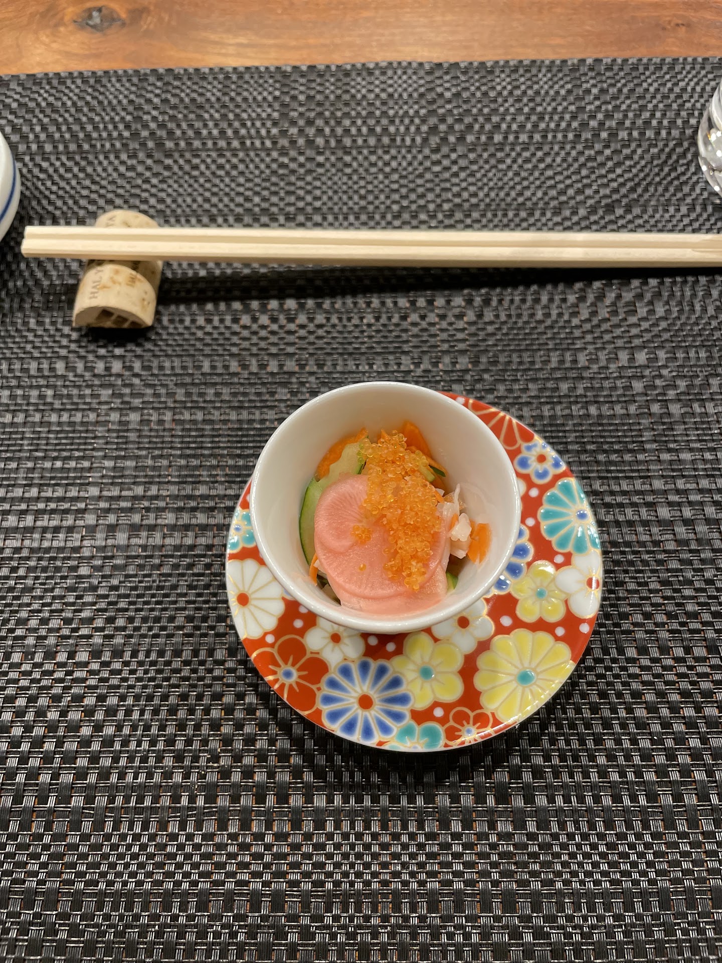 1st course: a warm savory egg custard with a gelatinized dashi broth on top, with a segment of shrimp and 3 slivers of snap or snow peas. It was quite tasty and the texture of the egg was very silken.