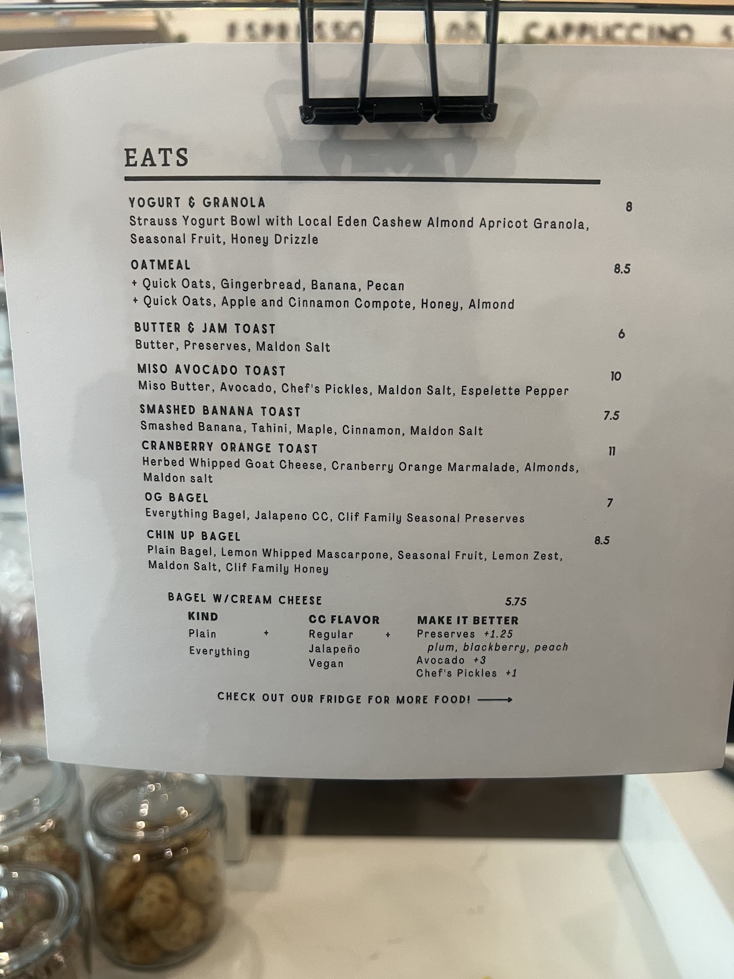 All were amazing but what really stole the show was the everything bagel with cream cheese and peach preserves! It was so good we had to have one more. Avocado toast was also very nice, with the perfect mix of spicy and pickled flavors added to it. Would have to visit Napa again just for this cafe! Also the servers were very sweet and quick with our order which was helpful. Ate the food too fast to capture it but have the photo...