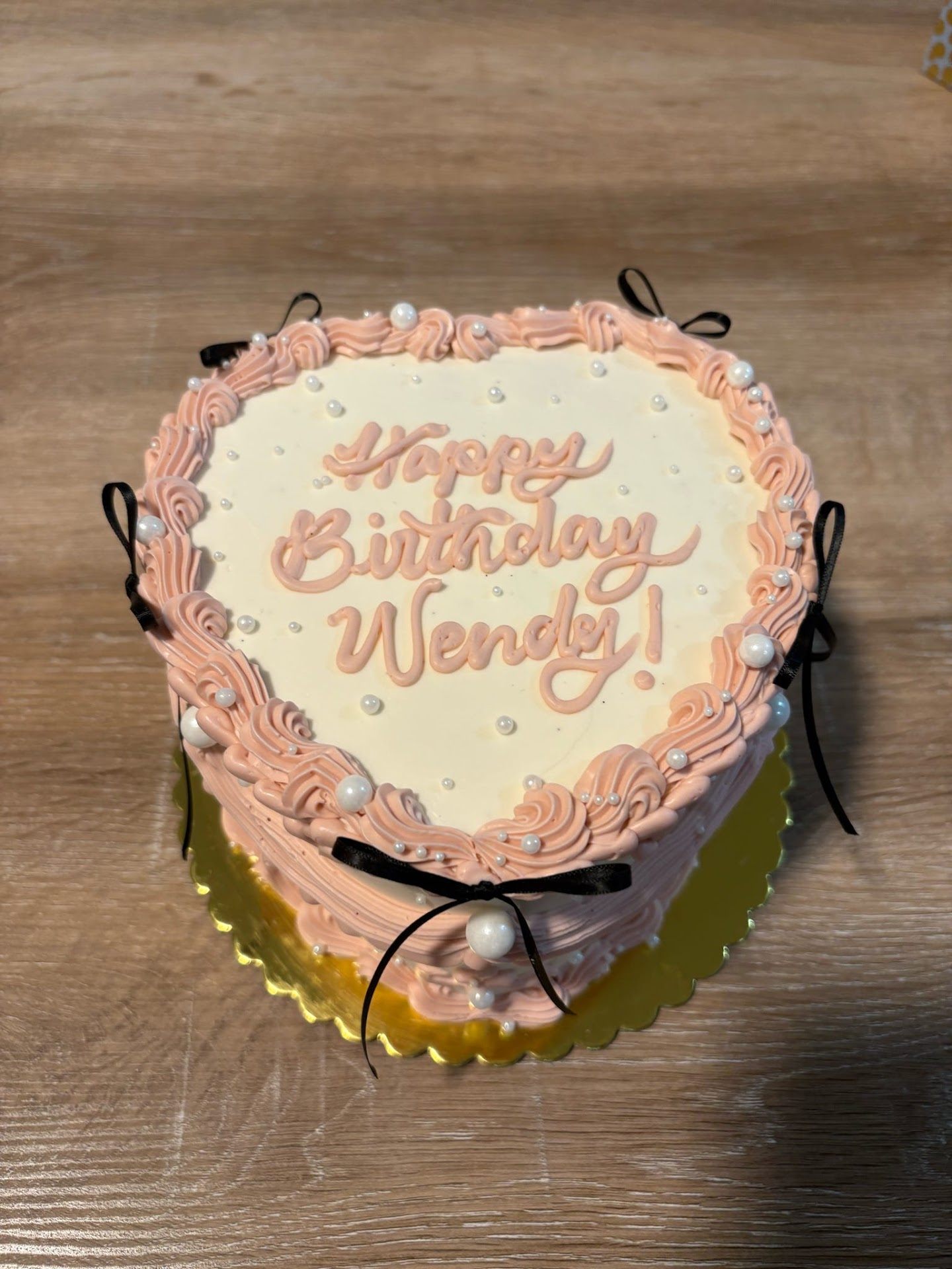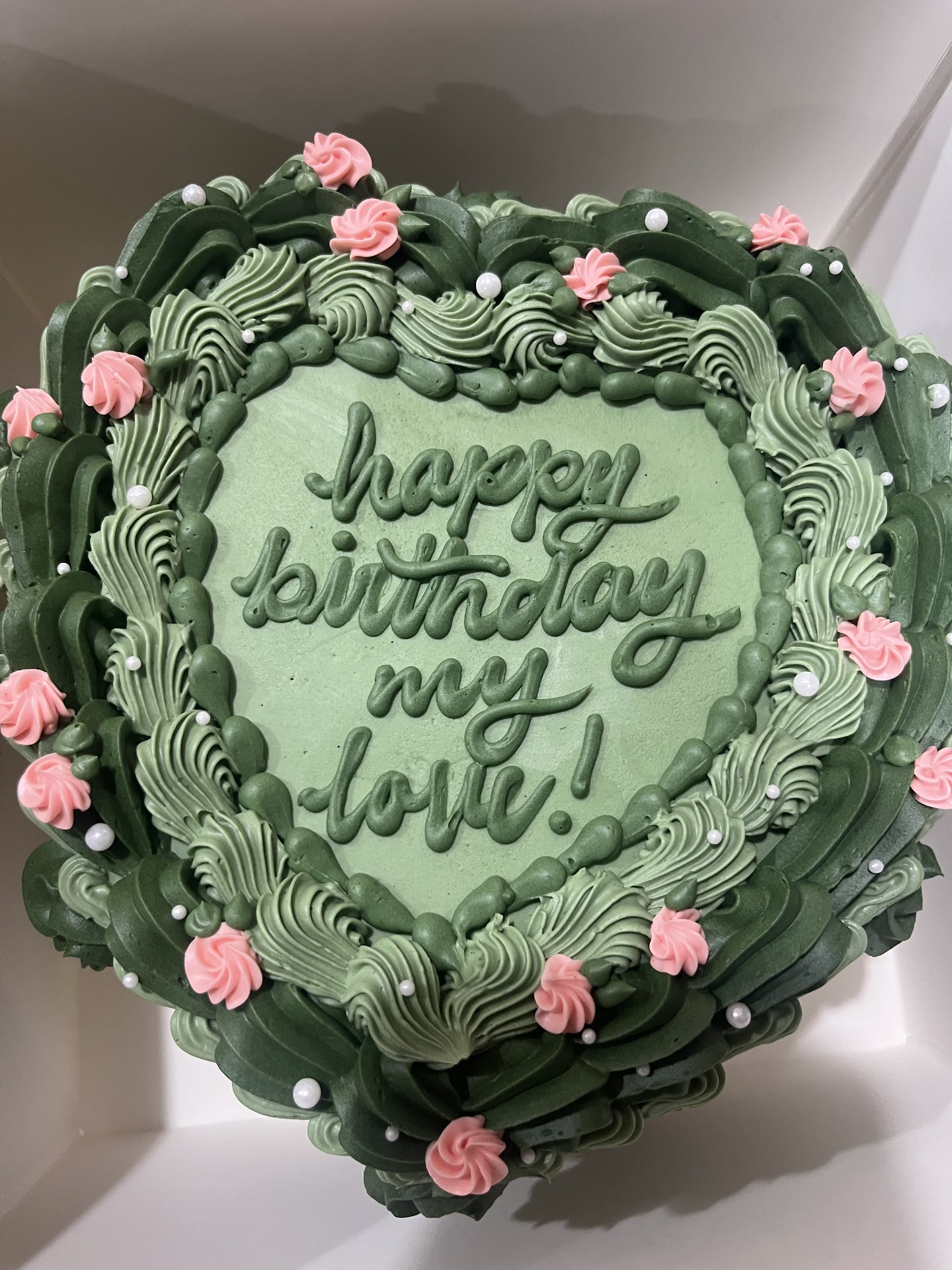 This is the only photo I have (they’re on my wife’s phone) of the custom vintage cake that I ordered from Peaches (Renee)! Backstory my wife is a vintage nerd/fanatic, and for years has been asking for one but it’s never worked out. I was in search for a baker worried no one would take it because it is super complicated and detailed (she made the cake way more detailed than imagined) and I reached out to her on a chance. I filled out her form and within a day she reached out! I sent her an idea picture with the colors which she absolutely hit on the mark! I marked whipped frosting and she super kindly explained that it’s not super feasible to use the frosting and butter cream will produce a better detailed look (take her word on it)! I’m not usually a buttercream fan but the one she uses isn’t too sweet and I don’t feel like I’m going to get cavities from it either! My wife is a fan and loved it. Now the actual cake was a chocolate cake with raspberry filling. The cake was the perfect balance between light but also rich/satisfying! She doesn’t use that super fake jelly stuff either it tasted like real raspberry and it wasn’t just a weak layer it was present and perfect! Thank you for making it special Renee and would recommend her for anything! I forgot she was super flexible and communicative...