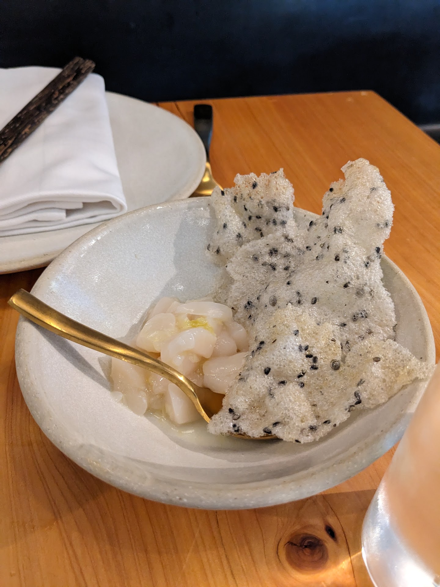 The ambiance is cold / stark / modern, and as fans of modern we appreciate that, but definitely the restaurant needs some cushions on the cold metal benches and something to dampen the sound. I think in the summer when the courtyard is usable it will be a very pleasant place to visit with more of an indoor / outdoor flow. More on the location later in this review.