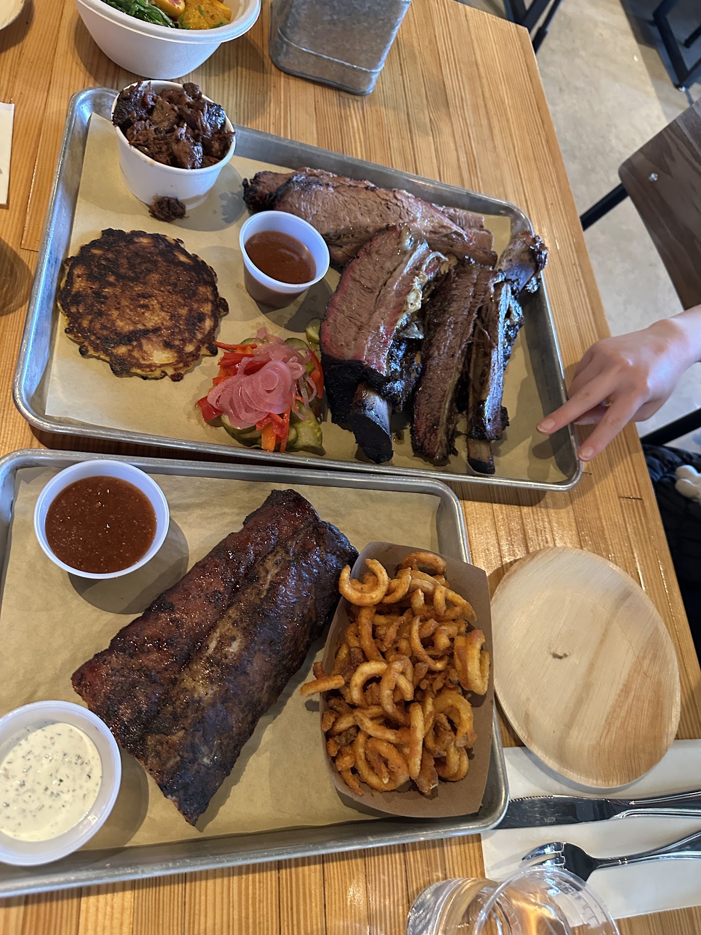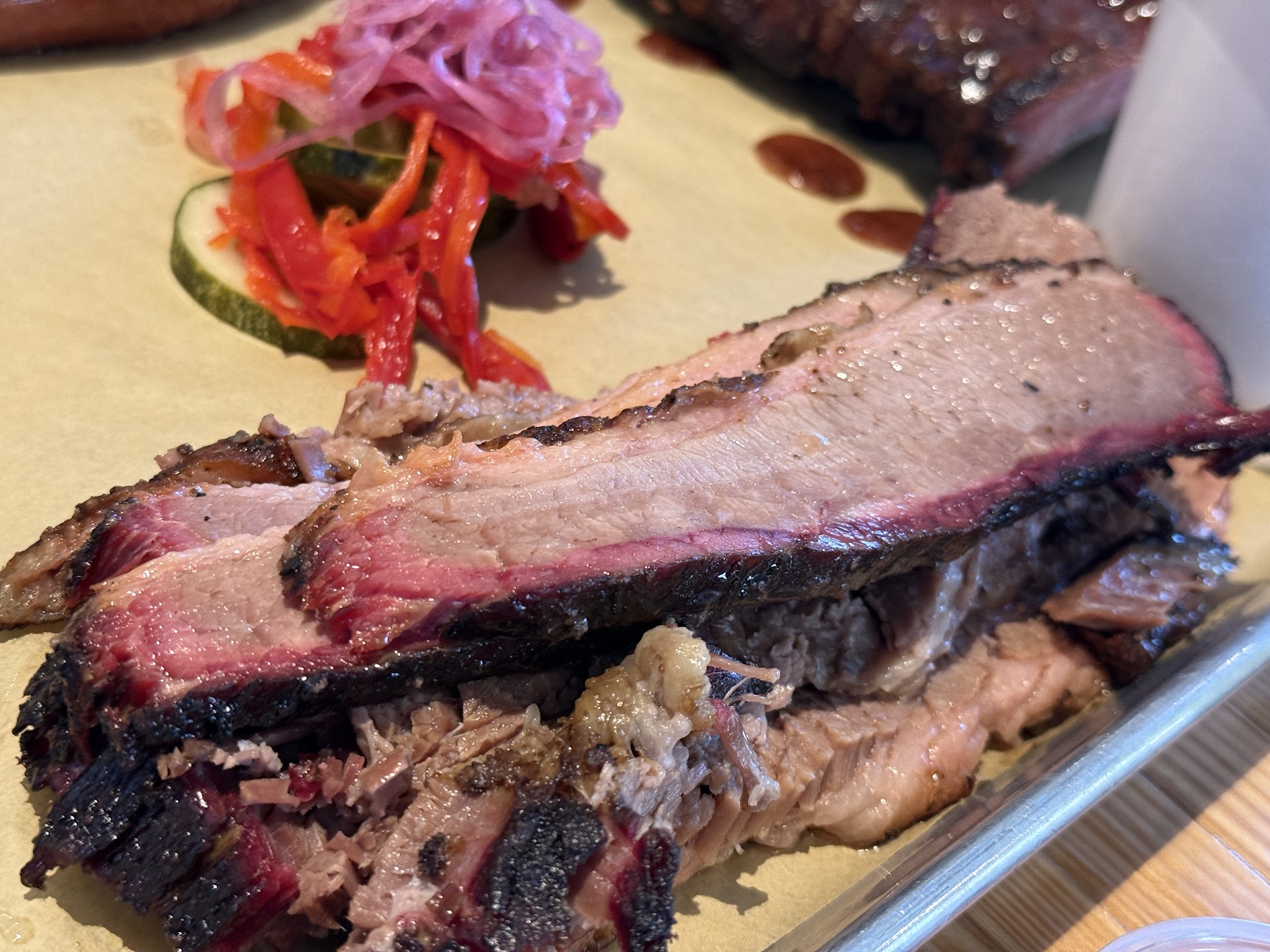 The brisket (1st order) was fantastic. Nice and tender, nice amount of fattiness, a little ribbon of fat left on when it was trimmed (i prefer texas style brisket, no sauce, but generally it was done well.) (2nd order) Overcooked, too tender. I couldnt move the meat to my plate without it falling apart. Even the stack of meat on our platter looked drastically different from the first order. 1st was nice shingles of meat, the second was a messy pile of semi shredded falling apart meat.