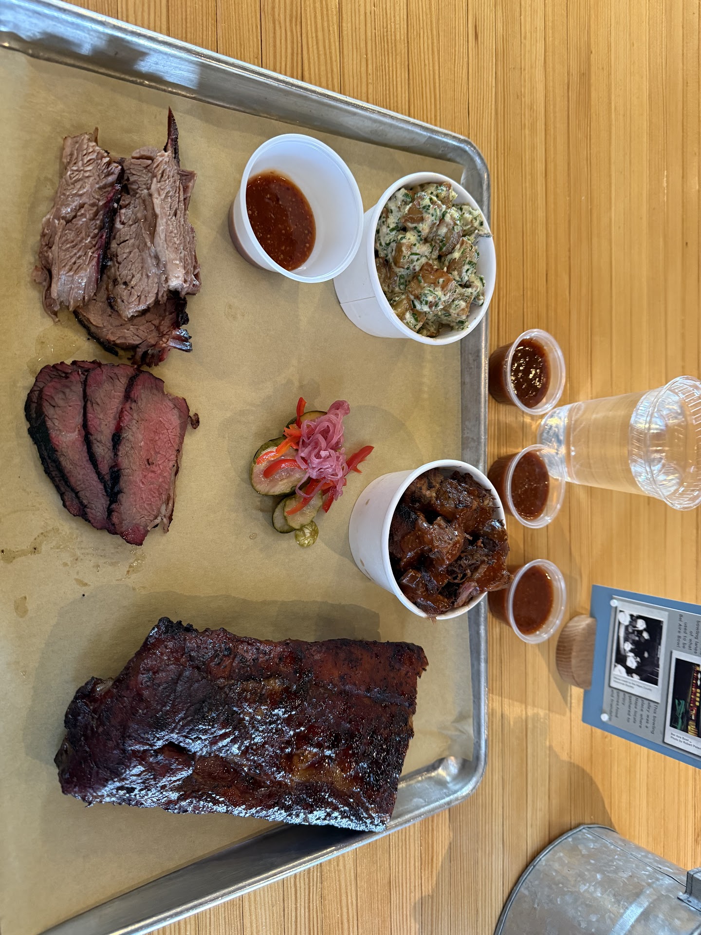 Something to note - We got there, ordered, sat down and ate. Most of the way through we realized we wanted more (to take out, and try a couple other things (more brisket, fries, deserts, soda). Since we got there before the rush it was pretty quick. I saved the table and the other two people went to order more. I was asked by 3 staff if I needed help packing up the food in my wait for more food. I felt awkward waiting. They needed/wanted the table for more people, but we were still finishing out food, and waiting for more food. Not sure what to do in this instance. Give up the table to hope to find one during dinner rush?