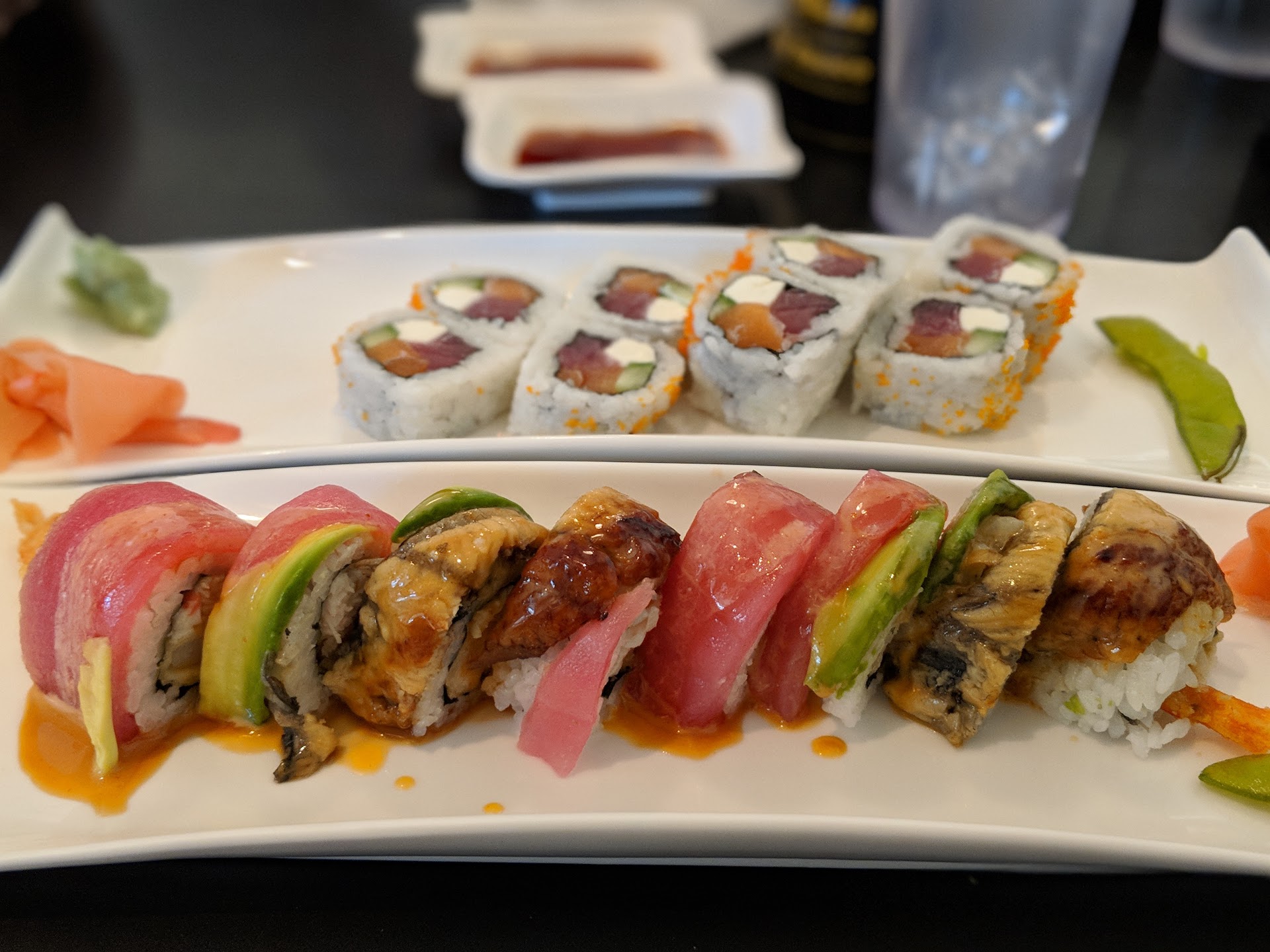 The tuna and eel roll we ordered was decent but nothing mind blowing. The plate was beautiful but the taste was nothing to die for. They say sushi is an "experience" in each bite. If that's true, then this would probably be the equivalent of the 'kiddy' roller-coaster built for attendees who are below 48 inches. All that to say, for the amount we paid I hoped the quality would be better.