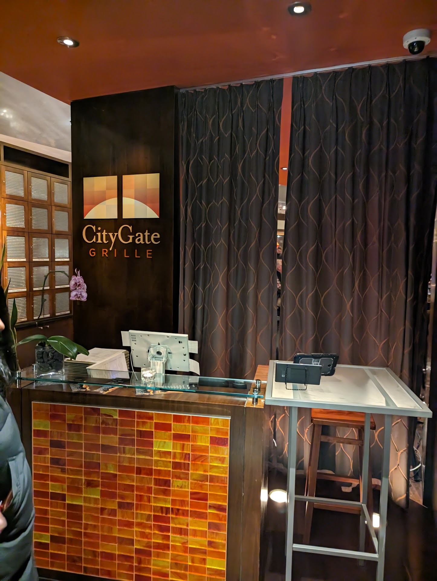 Read moreI dined at Citygate yesterday evening for the first time. The restaurant has a cool vibe and is nicely decorated. When you walk in, there’s a nice bar area with banquette seating or a few high top tables. The dining room is fairly large and there’s also an outside patio on the ground floor. The bathrooms are located on the ground floor as well. There is an elevator to go down if needed. They’re not close to the dining room. Our server was Carmela and she was sweet and friendly. She provided great service and was on top of everything. We were a party of four, and we all started with cocktails, old-fashioneds for three and I had a bees knees. Cindy, the bartender, made one of the best bees knees I’ve ever had. Next a sort of bread service was brought to the table, soft pita triangles served with roasted garlic, grated cheese and balsamic vinegar. We ordered an appetizer to share, the nightly special, which was peach bruschetta. It was grilled bread topped with mascarpone, jamon and peaches drizzled with balsamic. Very tasty. My cousins shared a Greek village salad, and my husband and I shared the Caesar salad. I like that they came out individually portioned and we didn’t have to split it ourselves. Nice. For entrées, my one cousin had the salmon pesto and the other had the seared tuna. They said both entrees were very good. My husband had the grilled kobe meatloaf. My husband shared some of the meatloaf with all of us so we could taste it because it was so delicious. The meatloaf was very flavorful with a light cream sauce served with whipped potatoes, green beans and crispy onions. It was a hit. I had the whole Greek bass, which was a roasted whole branzino with herbs served with Greek potatoes and an herb infused olive oil on the side. The fish was tender and flaky; however, I make better Greek potatoes. Some were soft, some were hard and the lemon flavor was lacking. The potatoes were a miss for me, and I was so looking forward to them. We passed on dessert because we’re so full, but we headed into the bar for a nightcap (all of us enjoyed Eagle Rare 10 bourbon) and listened to the live music. It was a perfect end to the night. We will definitely be...
