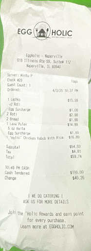 Read moreWe placed a pickup order on 04/03 around 10:30 PM, which included Lachko, Lava Pulao, and some pieces of bread. While we understand that it was later in the evening, it was still within your operating hours, and we expected the same standard of quality as always. Unfortunately, the food we received was extremely disappointing, lacking in both freshness and flavor. The Lachko tasted as if it were just a bland green peas gravy, and the Lava Pulao tasted like dry masala mixed with plain boiled rice. It was honestly inedible, and we ended up throwing the entire order away, which felt like a complete waste of money. We’re genuinely surprised and disappointed by this experience with EggHolic. Is this the level of quality and care you consider acceptable for your customers? We hope this feedback is taken seriously, as we expected much better from your...