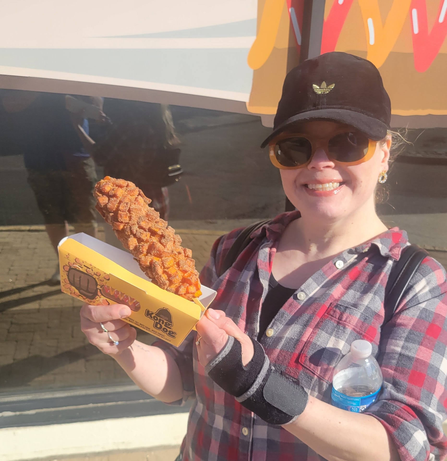 I got one original hot dog â half cheese, half sausage â coated in sugar (highly recommend!), Cheetos-sprinkled fries, and a blueberry lemonade slushy.