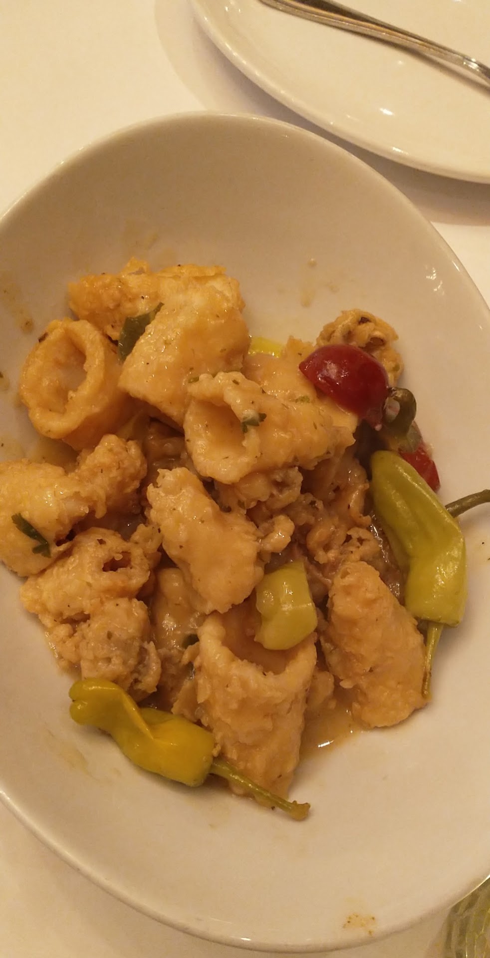 It was a nice day and we sat outside. The atmosphere was excellent. The restaurant had few customers. We started out with two appetizers. One was spicy calamari. The second appetizer was an arancini.