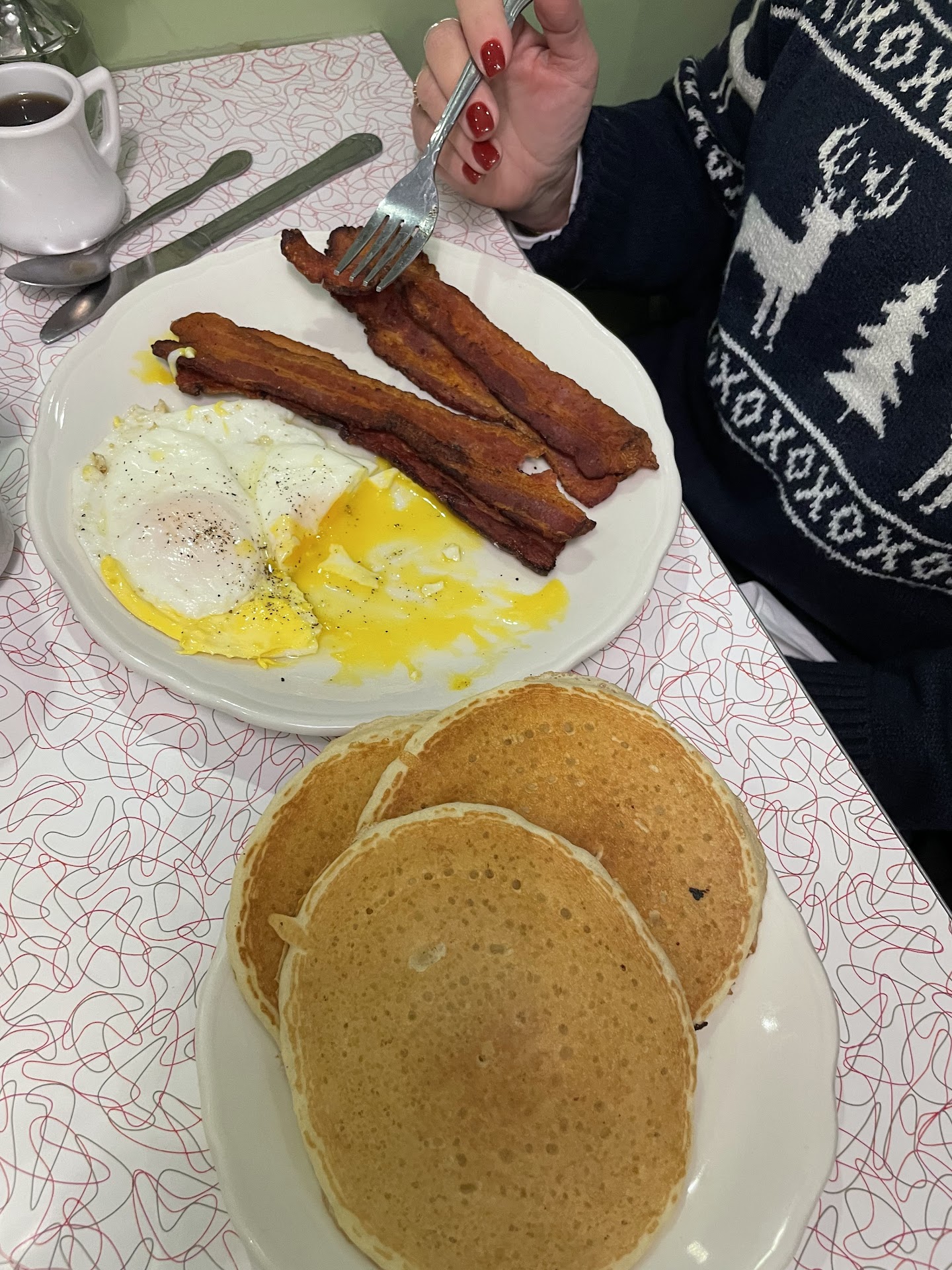 The server was incredibly friendly and attentive and offered us drinks right away. My wife ordered bacon and cheese grits and I opted for the chilli cheddar omelette and a side of flapjacks. The omelette came baked with melted cheese on top then smothered in chilli, definitely shareable if you aren't starving. It was huge! Due to my keto diet I could not try the flapjacks but my wife said they were delicious.