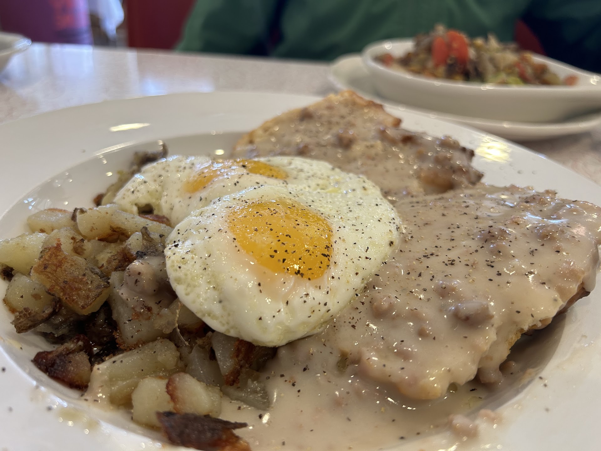 And don't forget the biscuits and gravy, which this place notes as a specialty. The biscuit was fluffy but hearty, and the gravy had chunks of pork without being too salty or greasy. Highly recommended.