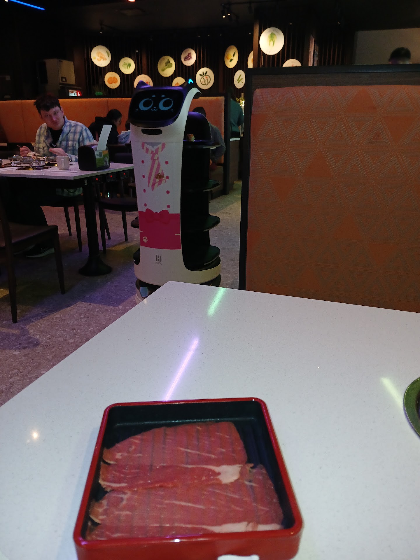Read moreWanted to try a new hot pot place while in town and was unfortunately disappointed. We were a party of 3. We were seated on a Thursday night and waited approximately 8 minutes before our server came to explain the menu. The restaurant was pretty empty, only three other tables with people. Once the server explained the menu and we ordered our broths, we headed to the self serve bar. Not a lot of noodles, we basically cleared them out at 8:30pm. Restaurant closes at 10. They weren’t refilled. Got our broths and one was wrong. My husband had to wait 20+ minutes to get his corrected broth. Not ideal when you’re on a 90 minute time limit. My Korean broth had no spice. The manager came to our table to ask us how everything was, and I mentioned the broth not being at all spicy or having flavor. He apologized and said they probably forgot to add it. Meat slices are paper thin, not worth the price when it’s $60 for wagyu. Robot service came like 5-6 different times, not fulfilling our entire order. We had to order multiple times before getting our sushi order. Manager stopped at our table like 3 times to have a conversation while we were eating … again 90 minute time limit, let us eat and wait until the end to actually get feedback. Our server kept apologizing for being the only one working tables and that’s why service was slow. How hard is it to wait on 3-4 tables?? He seemed so unhappy to be there. Submitted their feedback survey because was told we’d get 10% off. Well, the coupon is for our next visit… which won’t be happening. Consider lowering your prices or improving the quality of service, food, and the...