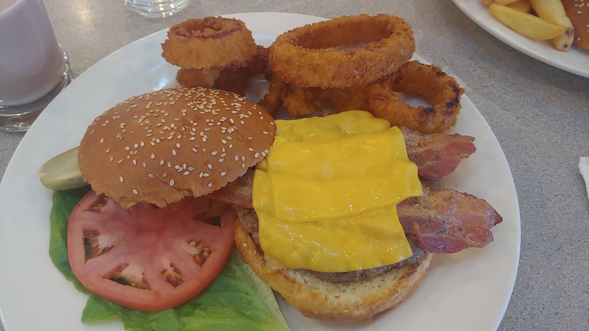 Looking for that classic Greek owned restaurant feel, with the usual pink and wood color scheme that just takes you back? This is the place that'll do just that! While a tad old fashioned looking, I feel that's part of the charm, but don't take that as a down side, the place was very clean and well kept! The table we sat at was fine and the booths looked very comfy. Onto the food! What we had was a Gyro appetizer, and that was absolutely delicious. Simply perfect. The lunch we had on the other hand, which includes a bacon cheeseburger, French Fries, and Onion Rings, was decent! Certainly not bad by any means, but the flavor of the meat for the Burger didn't really stick out as super unique. The words I'm using may sound odd, but easily put the burger tasted.. like a burger and that's it. Nothing stood out or wowed me about it. The onion rings and fries however were excellent! A shame the soup wasn't ready at the time we came in, which was around 9am. The prices were decent, and the service was very good! Shout out to the story on the last page of the menu which explains how the restaurant came to be. Love details like that! 😊 As a final word, I think the breakfast is probably a lot better than the lunch, as there were loads of people inside ordering huge platters of breakfast goodness that we'll definitely have to try next time! I recommend trying this out, it's a good time. 👌