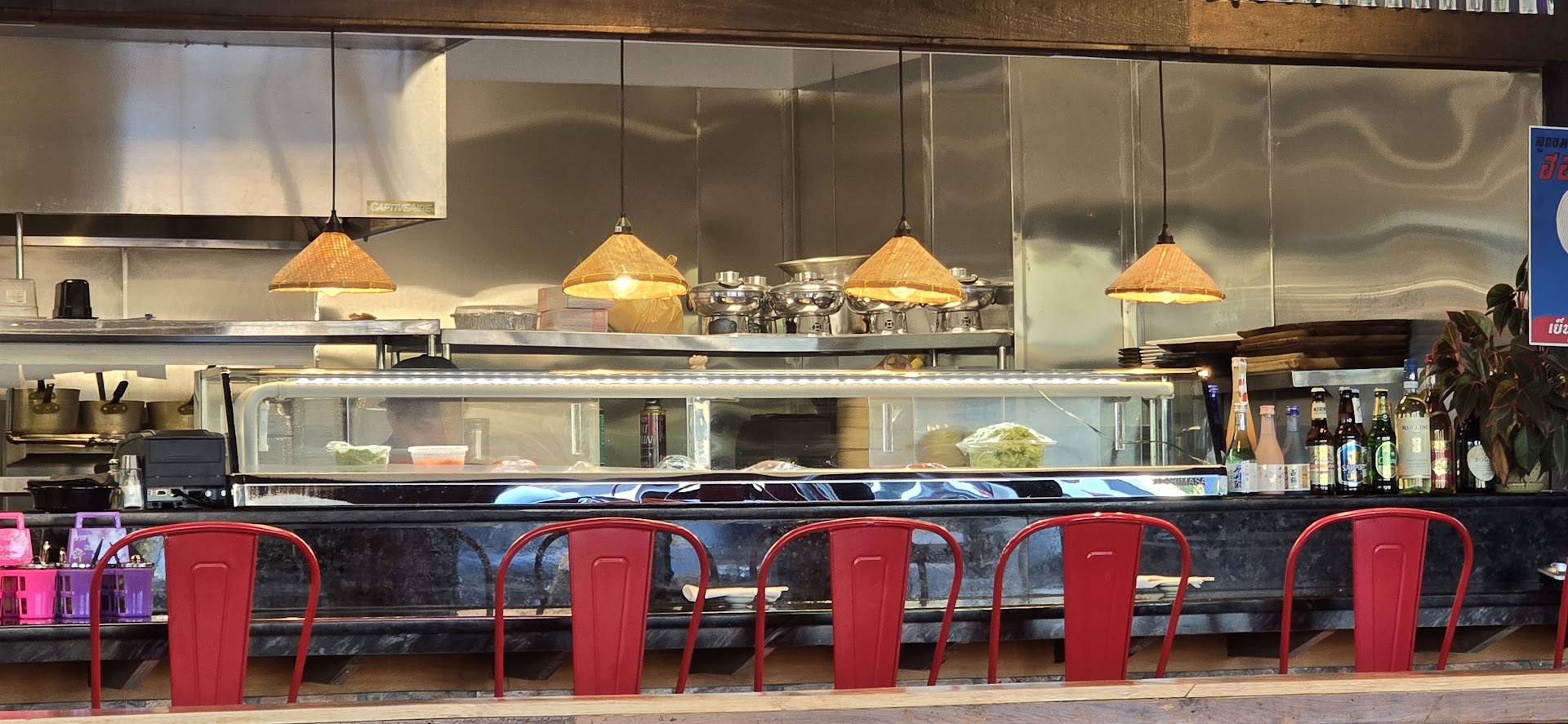 Food: They’ve got all the staples: salads, desserts, soups, a full sushi bar, and traditional Thai noodles and dishes. Plus, they’ve got standard beers and alcohol options.