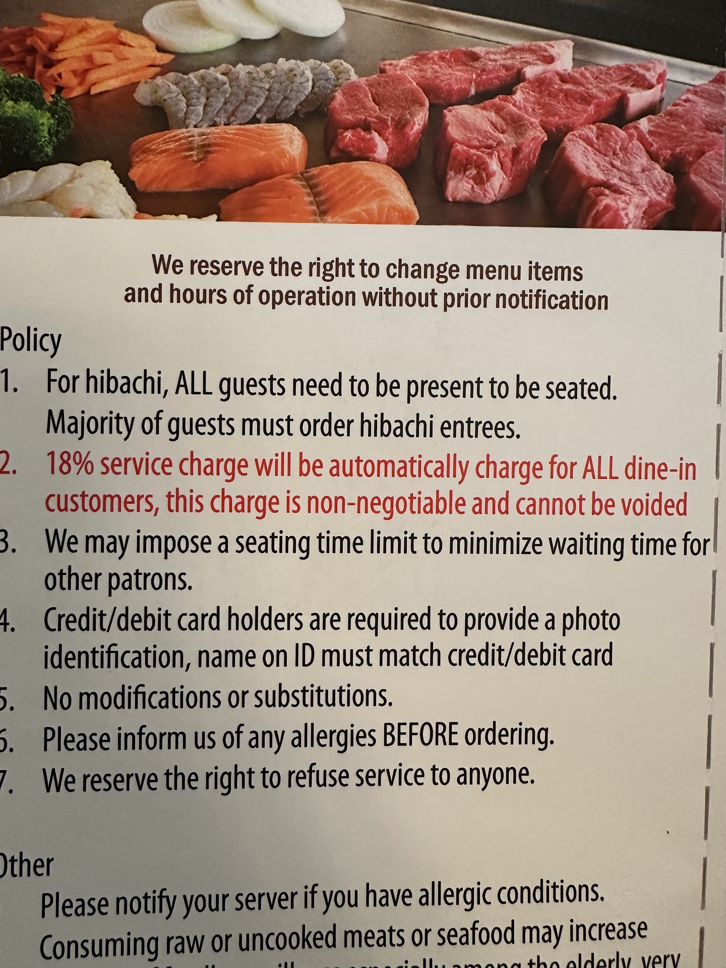 Read moreBeing told to "pick around your mushrooms" if you do not want them will get you a 1 star in my book. I followed up by asking "what if i had an allergy" and was answered with no answer. The waiter seemed confused by this question. Mind you, we were THE ONLY 2 customers in the hibachi section at the time. I question their ability to accommodate allergies. What sort of practices do they have in the kitchen where i cannot simply remove a certain vegetable?
