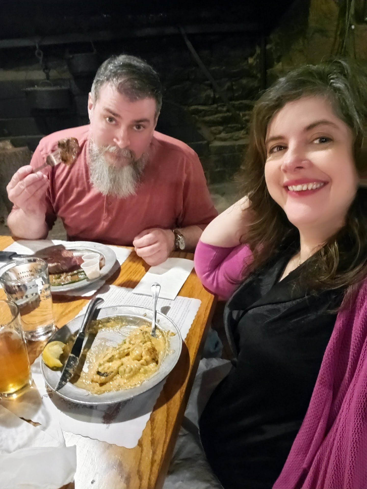 When you arrive, you have a choice of the main dining room, which is upstairs, or the tavern which is downstairs. We opted to head upstairs since we were there for dinner. It was open, lots of natural light, and a nice bright atmosphere, though the main bar was here. When we asked about the tavern downstairs, it was explained that it was a bit darker, candle lit, and had a different ambience, which actually sounded more appealing for our date. A short walk downstairs confirmed that the stone walled tavern experience was what we wanted, and reminded me of certain restaurants at Colonial Williamsburg.