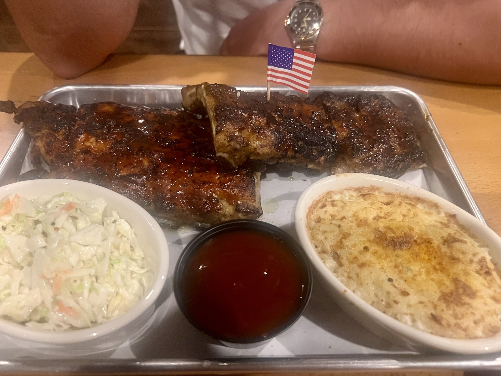 We shared two meals: a half-rack of ribs and wings. Each meal came with hot, delicious bread, a fresh salad, and two sides—plenty of food, with leftovers to take home. The ribs and wings were perfectly barbecued—not overly smoky, just flavorful and tender. The macaroni and cheese was amazing, and the coleslaw tasted fresh and crisp.