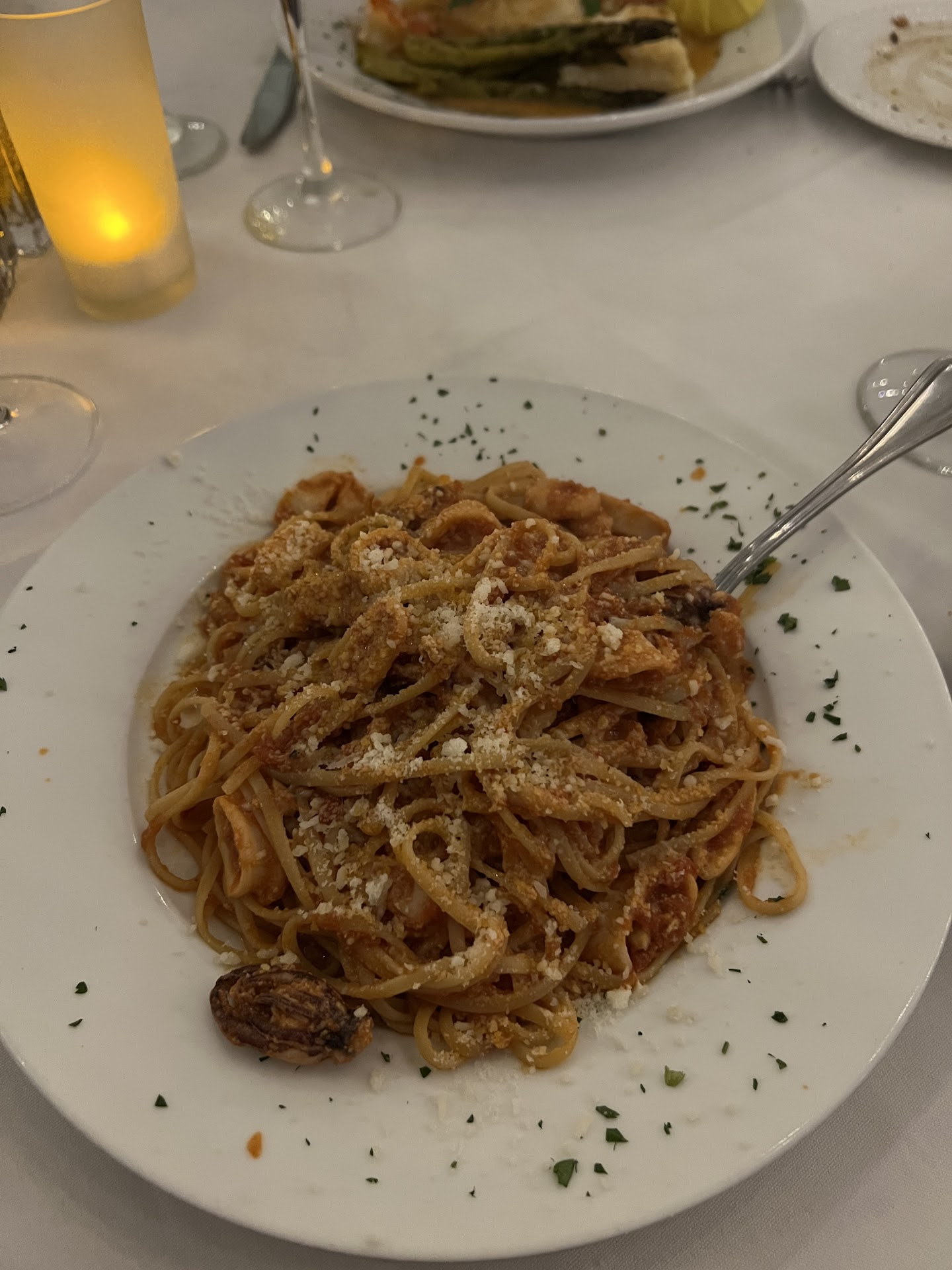 My husband had linguini with lobster, shrimp, clams, calamari, tomatoes. What a scrumptious broth that made. He topped it off with fresh grated cheese. He would have finished it but there was so much, I made him bring some home for lunch the next day.