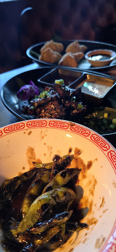 The edamame was amazing and was the best dish we had, other than that the food wasn't great. Crab Rangoon were real crab, but blended to a very strange texture and taste for Rangoon, they came out lukewarm, weren't crispy at all and were a tiny portion. The Brisket Bao Buns meat was lacking flavor, very wet and more like a sloppy joe with fresh herbs, neither my wife or I finished ours. Pickles were good and devoured. Beef jerky was not jerky, but slices of steak that were seasoned and grilled/charred but still chewy, good but not like Asian jerky at all more like burnt ends, wouldn't order again.