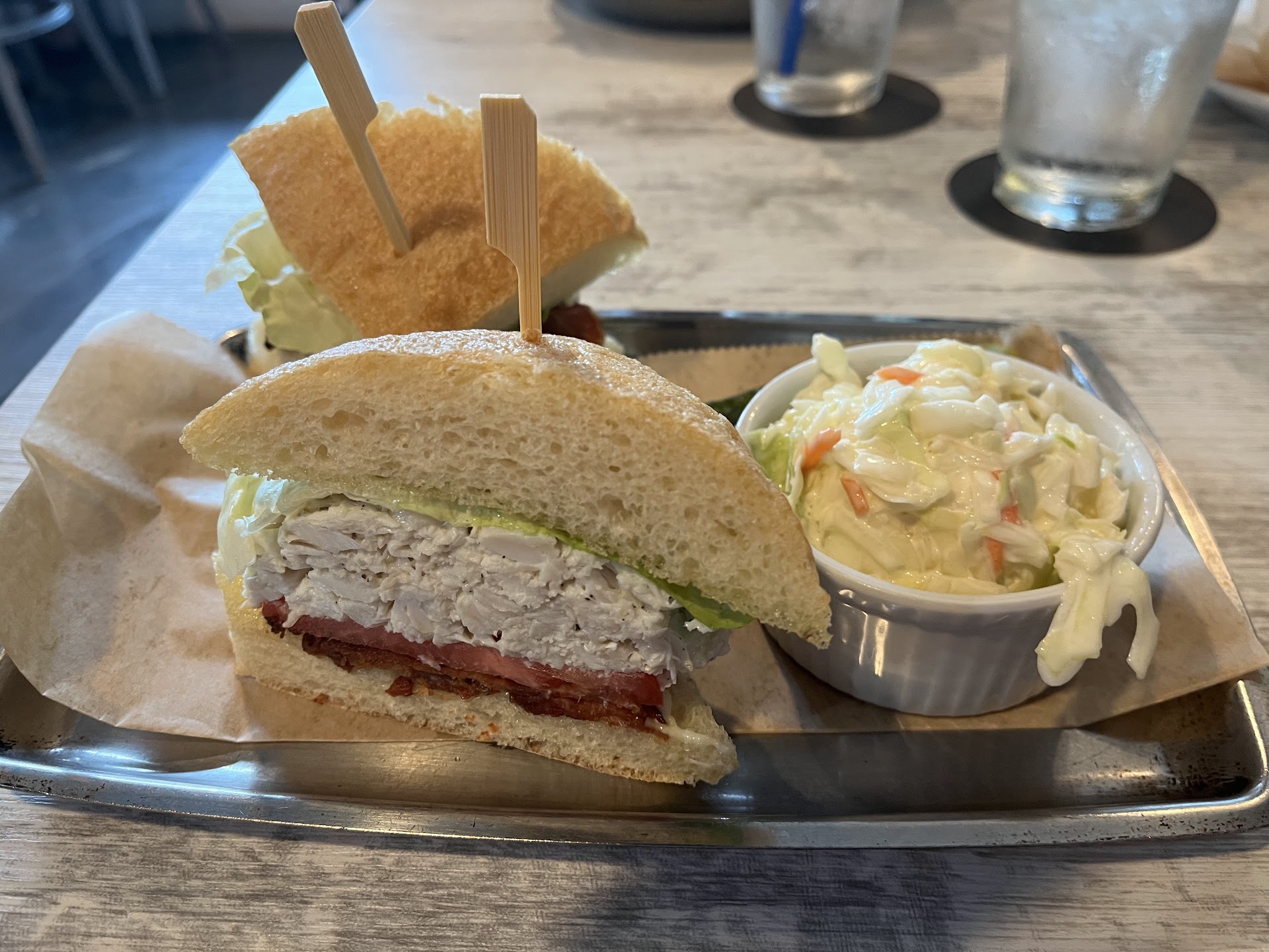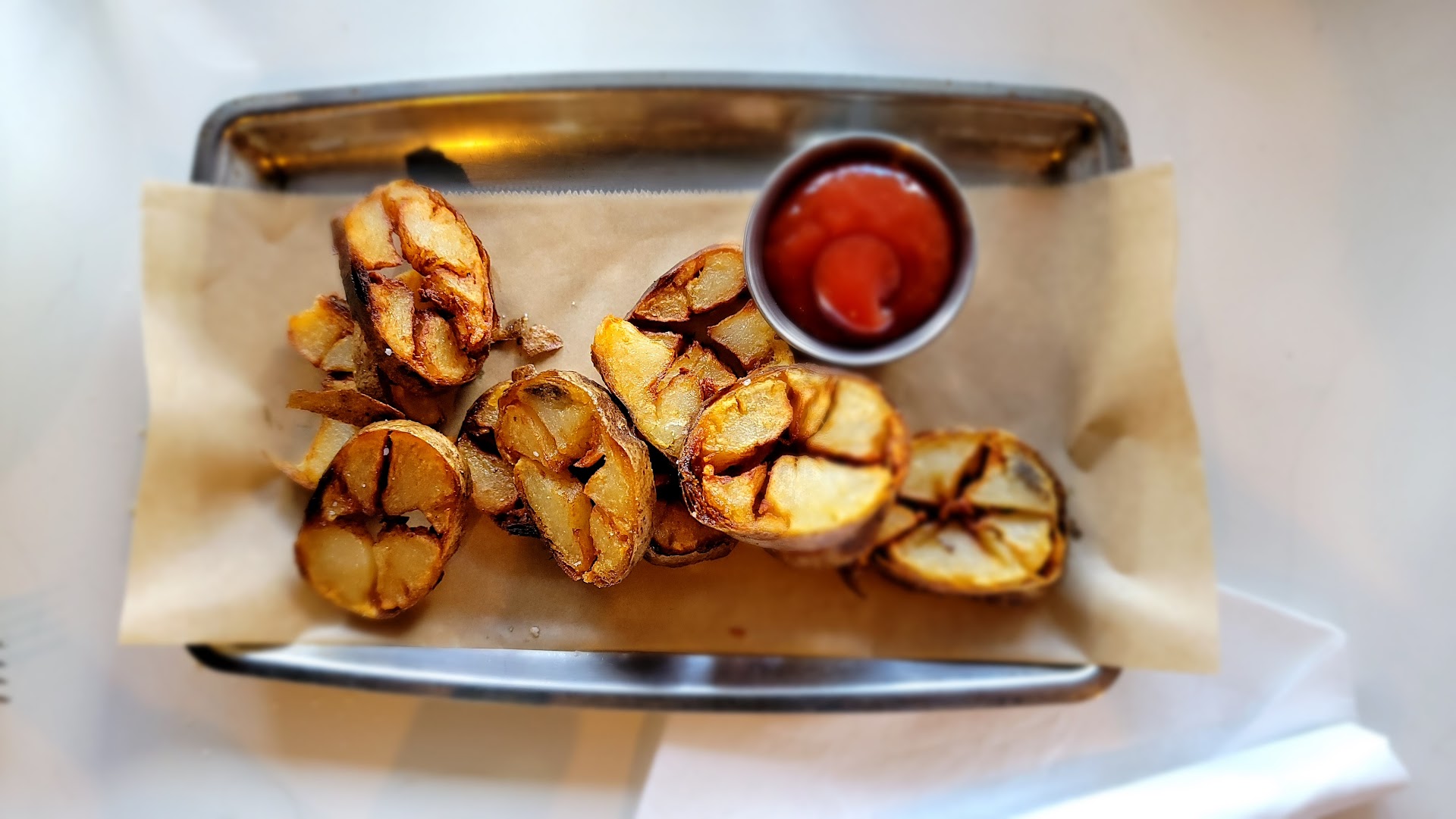 After being seated, we took a look at the menus. After inspecting the one page that they handed me, I flipped it over to see what else they had, but was sorely disappointed when it only contained the name of the restaurant. The selection is quite thin and not anything that you would expect when going to a seafood restaurant. Basically it was a section labeled "Small Plates" and a section labeled "Sandwiches". They have no entrees, no seafood platters, no fried shrimp, no french fries. No plates come with sides: you have to order them, which stinks because the food is already expensive.