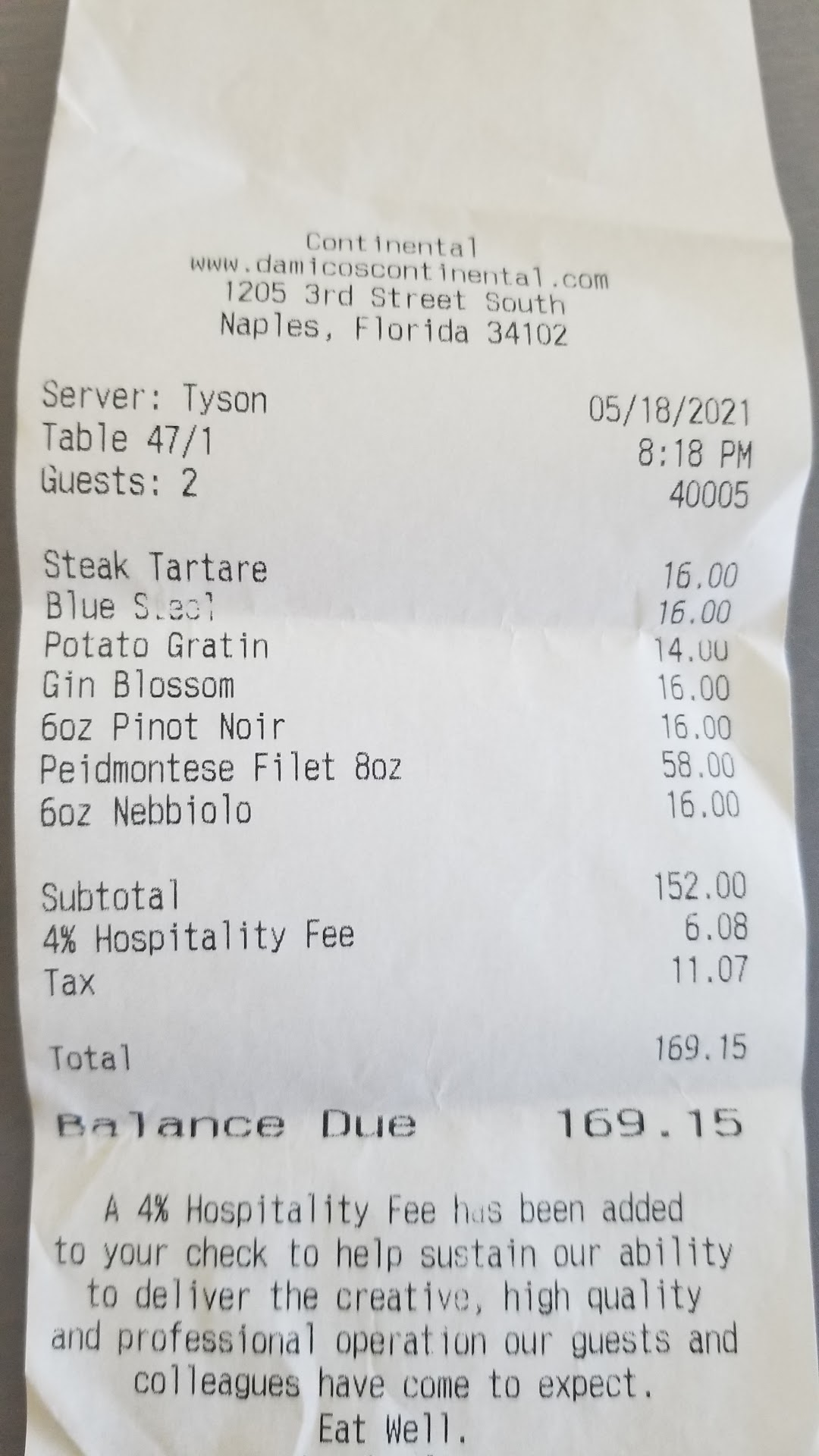 Fast-forward a week later, I receive a voicemail from a manager (who I will not name) who was sincerely apologetic on my voicemail stating that The Continental does not do business like that and that they wanted to 'make it right' for us. I then proceeded to have a text communication with the manager stating that we actually would be back in Naples in March with our brother-in-law and sister-in-law and would consider coming back to The Continental for dinner. he had said that they would love to have us, would make our reservations and looking forward to making this right.