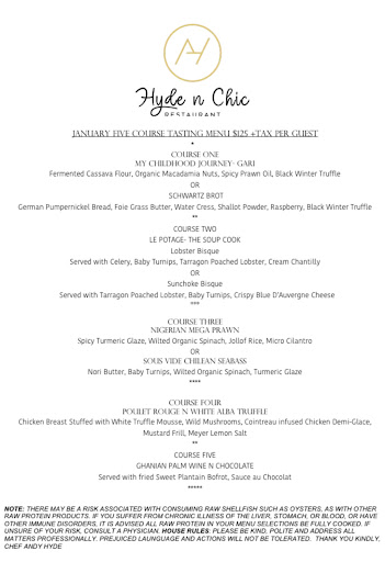 We dined at Hyde N Chic for the January 2024 tasting menu. We have met Chef Andy who is very nice and sampled the food at events in Naples, and we were really looking forward to enjoying the tasting menu in the restaurant. Our meal in the restaurant was a disappintment for us unfortunately. The food was good, but most of what we were served did not match the menu (photo included with my review). In course three, the seabass was very good but was missing the baby turnips. The prawn was an impressive size and good (a firmer texture than I was expecting), but missing the rice. In course four, we were served what appeared to be roughly cut chunks of roasted chicken breast with a brown mushroom gravy sauce — not close to what we were expecting from the description on the menu. There was no white truffle mousse nor mustard frill to be seen on the plate. For course five, we were served champagne ice cream. The flavor again was good, but this time a complete deviation from the menu.