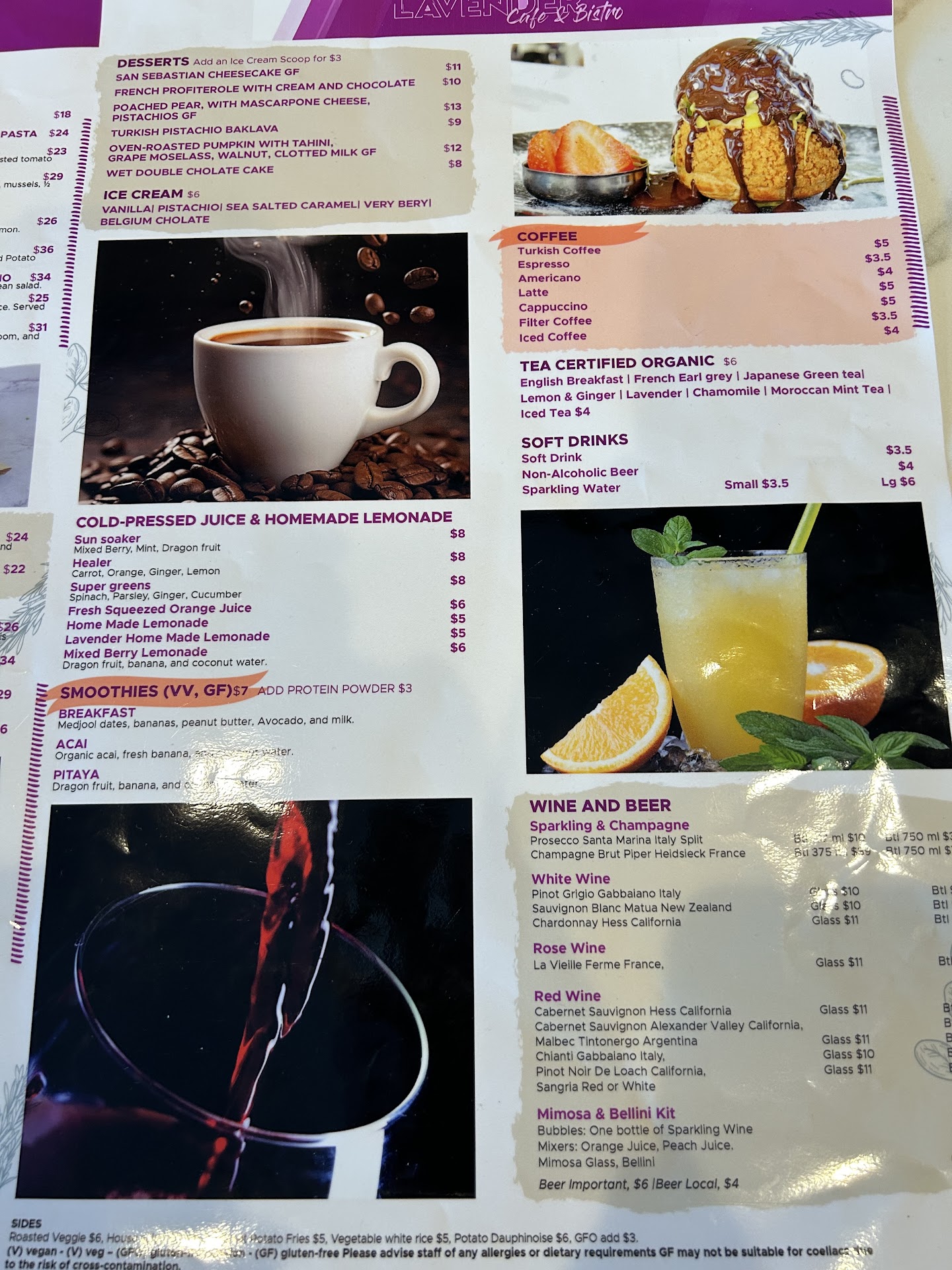 Read moreThis little gem of a Cafe/Bistro is truly a gastronomical treasure! The menu is carefully curated to reflect a wide variety of flavors and foods - something to please everyone! Prices are reasonable, for generous portions of perfection on the plate! The presentation is so colorful and so beautifully arranged, without being pretentious. Attention is paid to small details such as demitasse spoons and saucers with coffee, and lovely water glasses (more like rounded low/balls) which elevates the overall quality of one’s dining experience. The decor is colorful and softly muted, with an element of crispness. The wait staff is attentive and enthusiastic - there is a team effort running this establishment. The owner greeted each guest upon arrival, and was proud to tell us that every morsel of food is the freshest available - nothing frozen, canned, or pre-made, and everything is made from scratch. They even make their own cheese for their decadent, light and fluffy cheesecake! Lavender Cafe and Bistro is a tiny place which is a GIANT in flavor and style. Our experience was a total pleasure, from...
