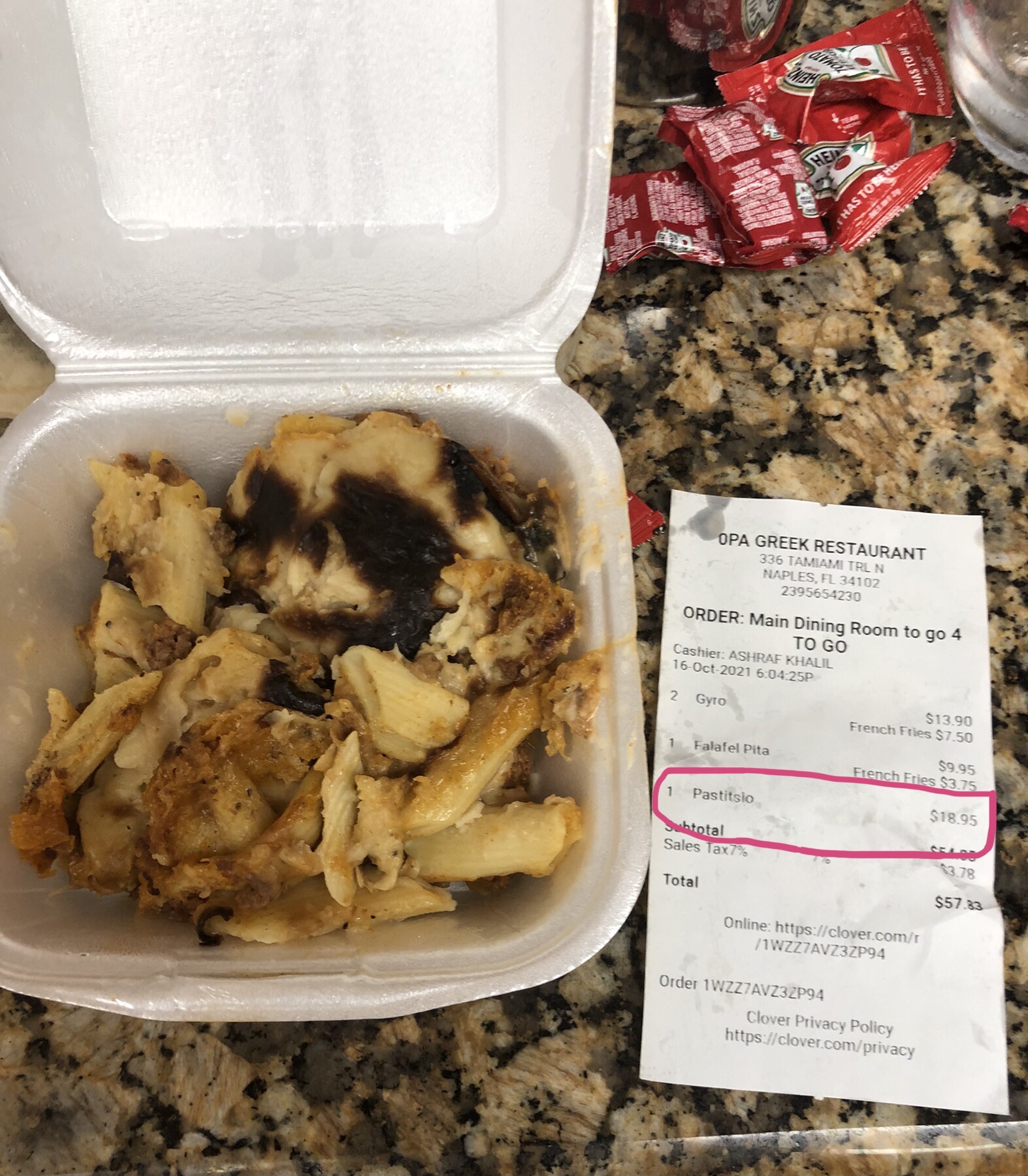 The real issue was getting to the Pastitsio. I honestly thought they had forgotten it. It was a full entree with an entree price (vs the other wraps that we ordered) and it came in the tiniest container and looked like it had fallen on the floor before handing it over to us. It didn’t look like anything but a pile of disheveled pasta. Attached photo for reference bc it was so utterly disappointing. We could have gone to any Greek restaurant but we chose to try Opa. I doubt...