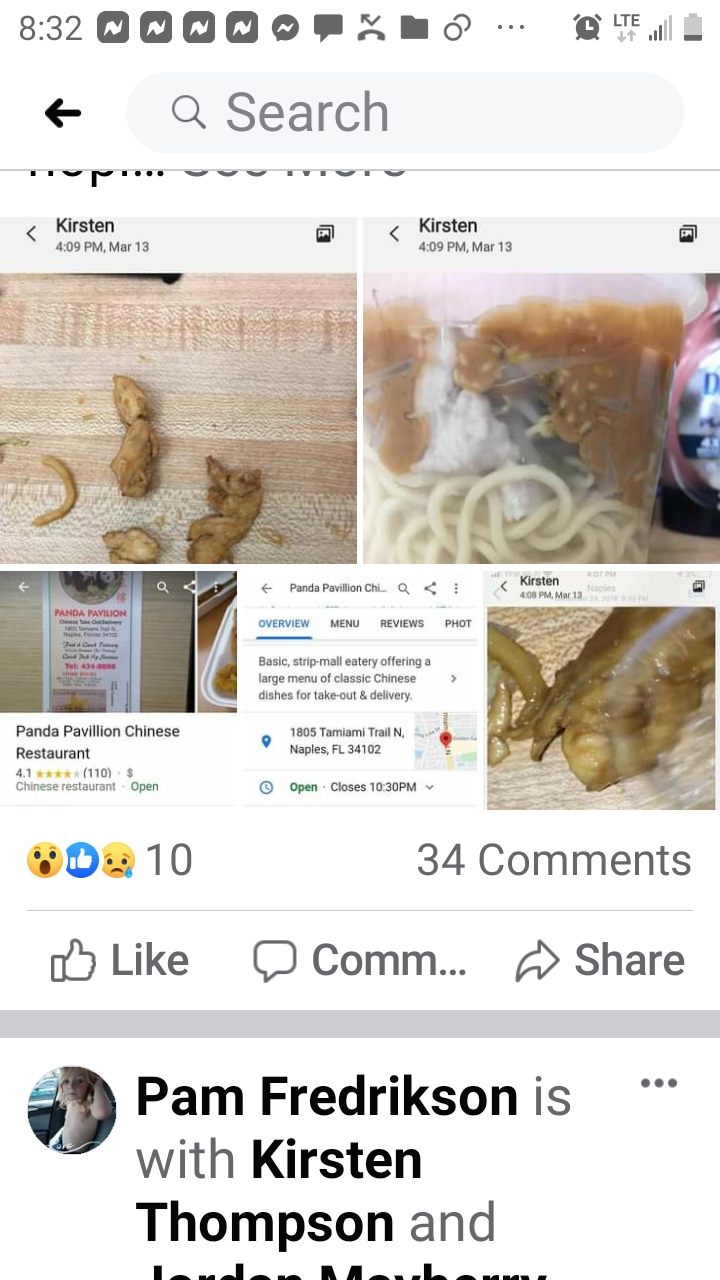 My daughter order delivery and this is what was delivered to her from Panda Pavillion!! When she tried to call them and tell them about this they acted like they didn't understand so I sent pictures to them but said they never received them. They refused to refund her $50 or acknowledge that anything was wrong with the food they delivered to us.They need to be SHUT DOWN!!!! This is going straight to the drug and food administration. Well it said add pictures but I guess they never went through. I'm going to try again but be prepared because they are very disturbing and disgusting. If the pictures don't go through go to my facebook Pam Fredrikson and request a friendship be cause everybody who eats there needs to...
