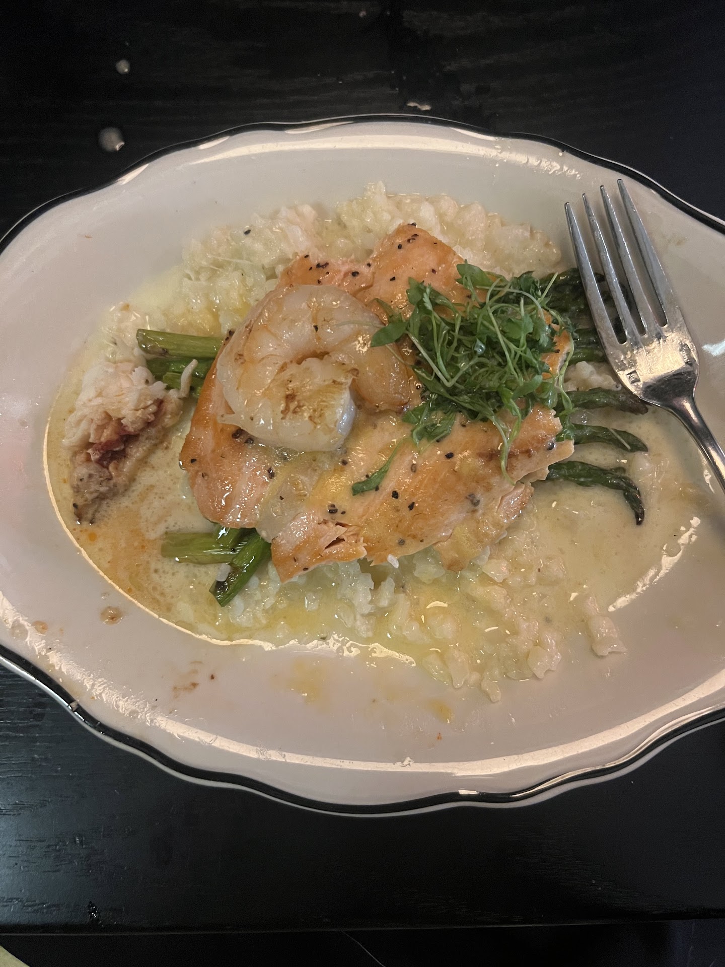 We all had a starter, from corn Caesar salad, cauliflower salad, oysters, beet salad and all were amazing! Oh, the chef did an Amuse Bouch of soup in a cute little terrine. Then more cocktails. Dinner was 3 Lobster & Filet w/Frites, 2 Salmon, 2 Tripletail special, and a full Lobster dinner. Everyone raved and from the plating to the last bite, everything was perfect.