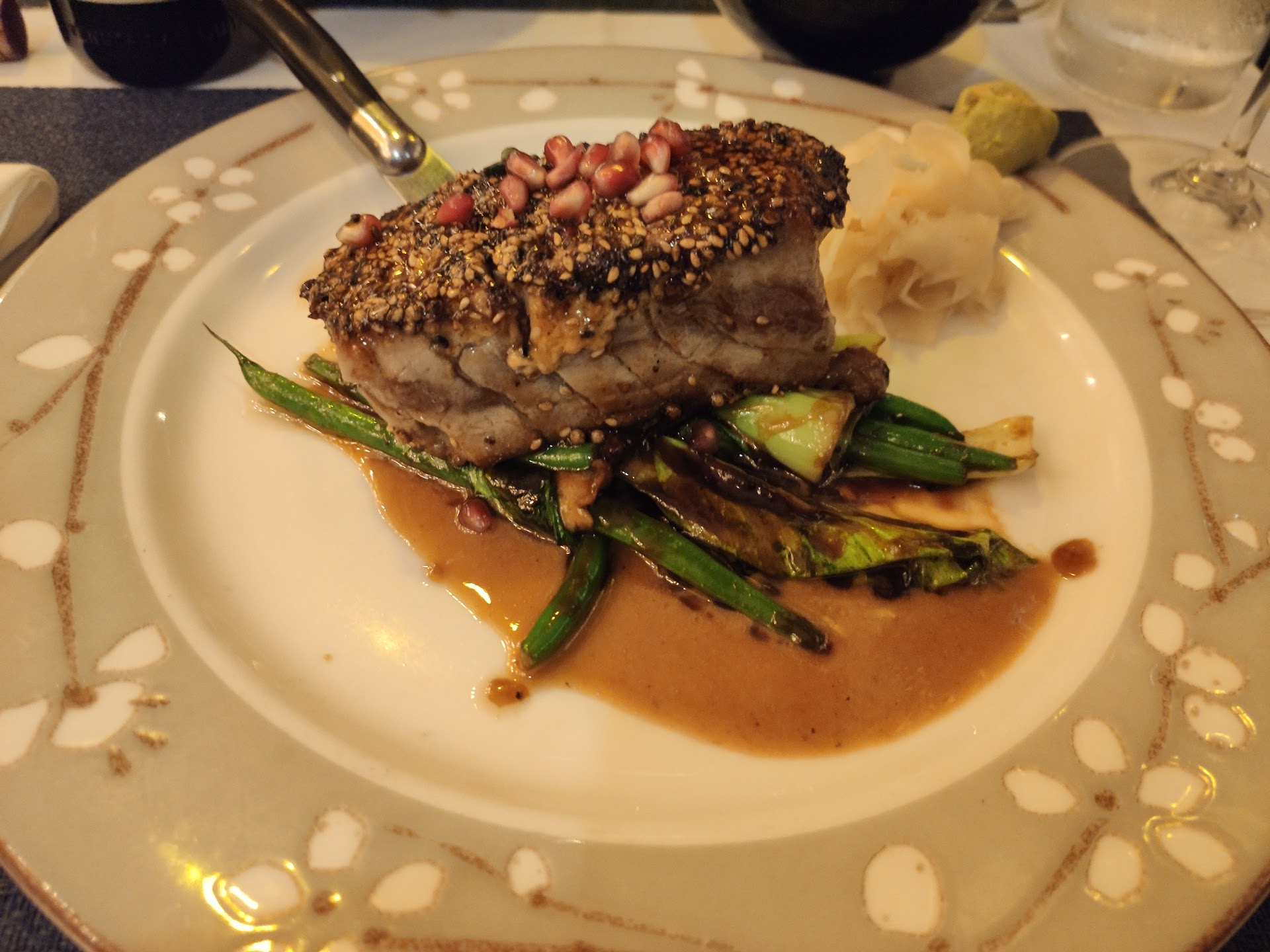 Our second appetizer was the selection of appys for $34! The yuzu shrimp tasted so oily as if the oil used needed to be changed, or the temp was too low so the shrimp soaked up extra oil, or it was parboiled and then refried. The dipping sauce for the tuna tataki was alongside the shrimp so initially we didn't know it we as for the tuna (actually still unsure as I type this). The tuna itself was served on a bed of raw bean sprouts and matchstick carrots. The ceviche lacked body and salt (avocado couldve helped transform this dish) and the 4th item was maybe just a garnish? It was the same seaweed salad and picked ginger combo as the complimentary schlop offering. 3rd strike.