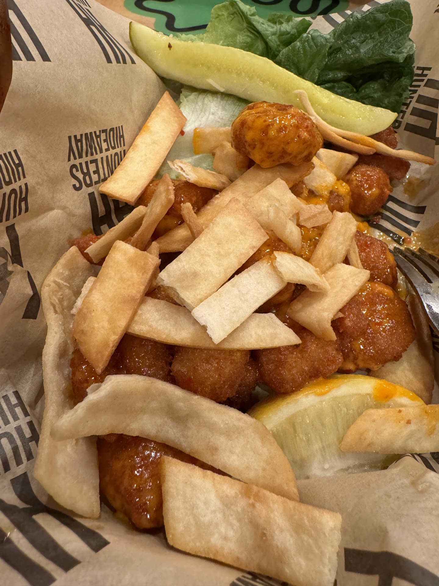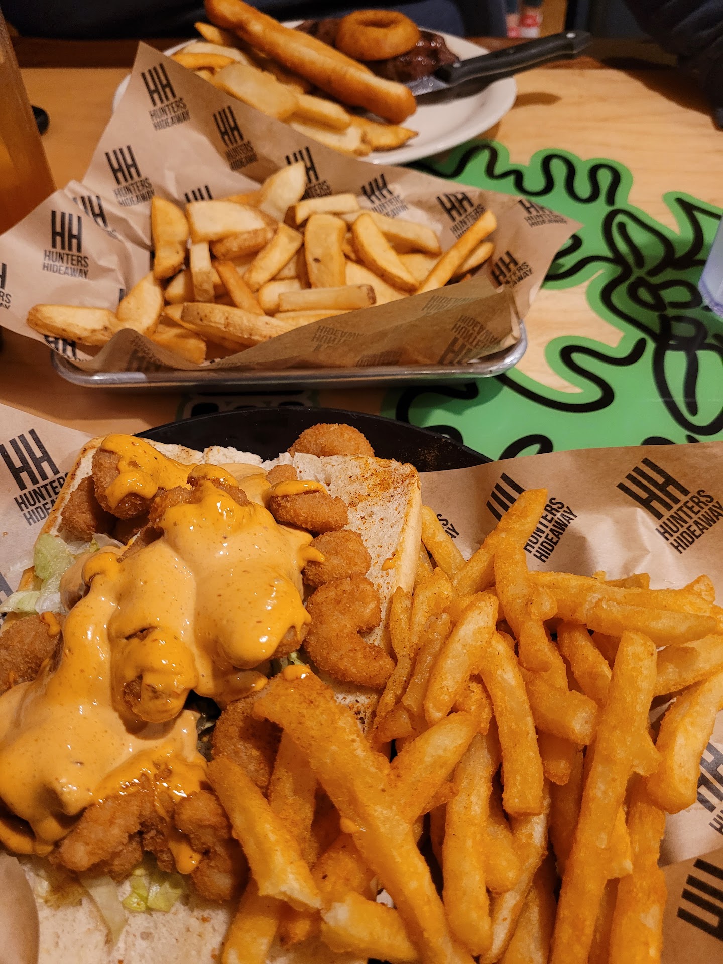 This is now our second time dining at Hunters Hideaway. First time my husband and I were in the bar seating areas that is very nice and cool atmosphere loved it. Second time there we sat in the family area with our family and kids personally not as cool atmosphere as the front area that was disappointing. Service was good but they seemed pretty busy but our waitress was still on it and great with the kids. We got several appetizers pretzel’s were amazing but four for the price and have several kids you have to order several unless you have a family of four and the price. Their breaded mushrooms are really good they aren’t that frozen bar breading definitely a nice pick with a light crisp hand breaded mushrooms you get a good amount for the price only thing I wished was they had some sort of maybe a house special sauce with the mushrooms verses just ranch when they have really good breaded mushrooms. I got the appetizer spicy shrimp as my main meal and you get a ton of shrimp they had a okay flavor maybe a little more spicy I would have liked them more. My husband got a burger that had spinach dip on it and he is not someone that would normally ever get anything like that on his burger ever and he said it was really good and he would get it again. One of my sons got the chicken quesadillas he really liked and it had good flavor, one of my sons got plain wings he said were good and my other son got boneless wings with the honey mustard sauce that he said was so so. Overall not a bad experience and we would go...