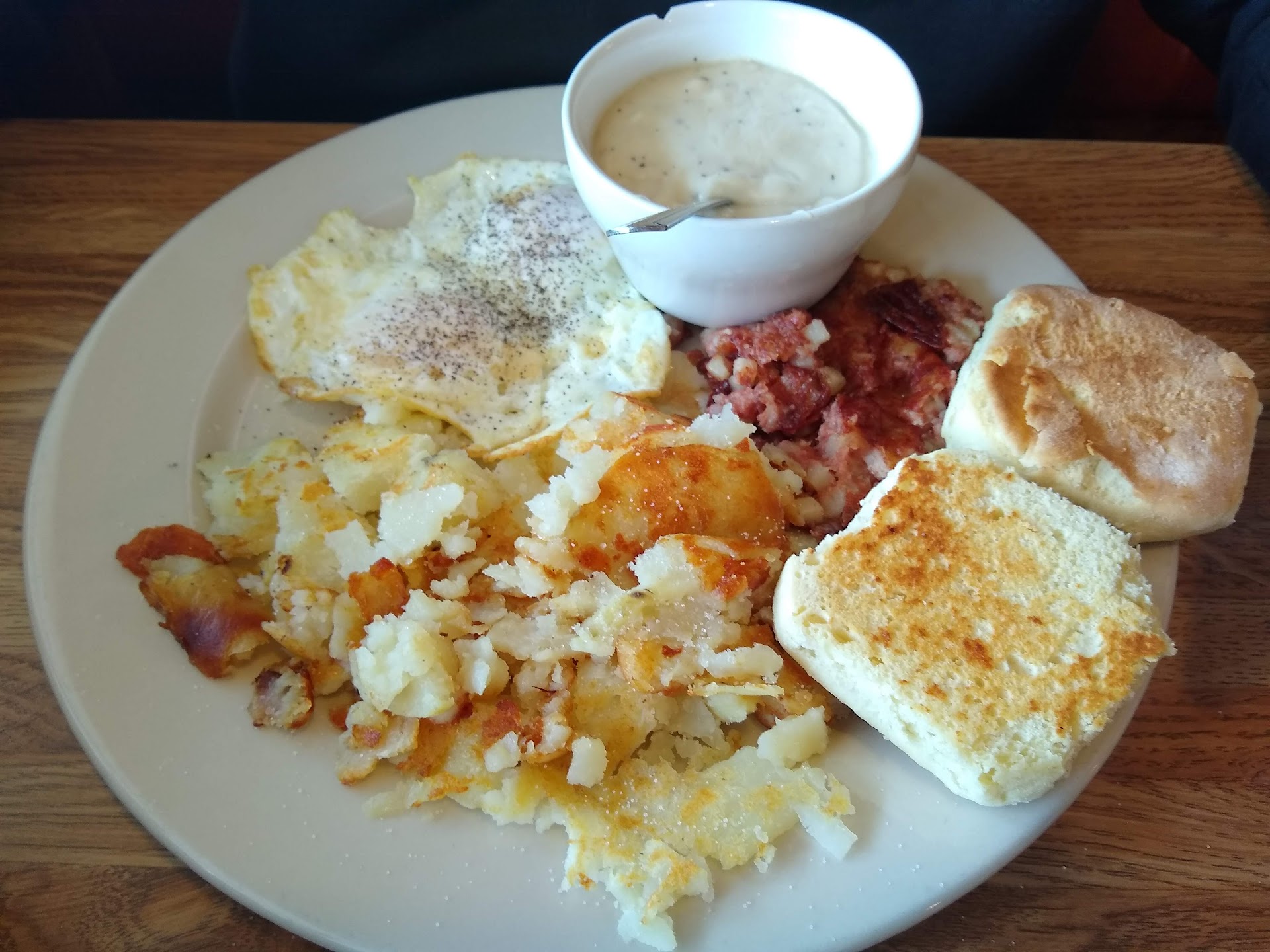 Ā Ā Ā Read moreThe sign says ābest food in townā⦠NOT! Hubs and I had āmeat and eggsā breakfast. Fortunately I asked ahead of ordering whether the biscuits were made here or not⦠waitress said āwe heat them up hereā. Ha! We both chose pancakes rather than biscuits with our eggs, meat, and hash browns. The eggs were good, hubās sausage was not. The pancakes were average, definitely from a cheaper boxed mix. The pecans I asked to be added made them edible. Hash browns were made of real sliced potatoes (probably baked potatoes from yesterday?!?) and were good but not great because of the oil. Bacon was crisp and thin sliced but greasier than normal. Patted it off and it was good. Expected more homemade food at a diner in Napannee, IN. Iāll be visiting an Amish...