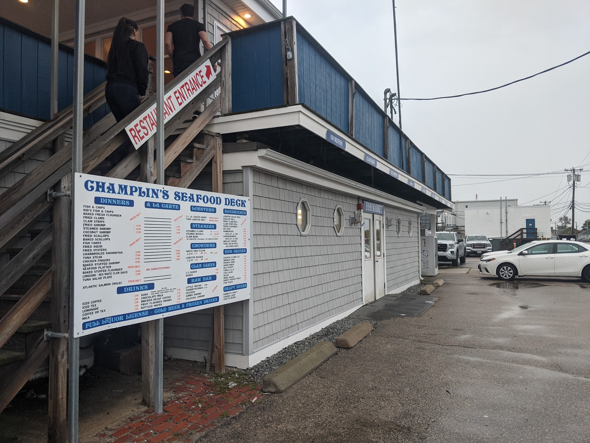 Three of us ate here on a Monday night in October. OK, I should have known from the run-down look of the building that perhaps this would not be a good choice for us, but Monday nights off-season have limited dining options. We climbed the outside stairs to the 'dining room', encountering seagull feathers and bird excrement on the stairs and the outside tables when we reached the top. In the 'dining room' we realized that the 'view' consists of a lower roof deck covered in seagulls and their white droppings. The floor of the dining room was not clean, and the tables are essentially long picnic tables. The hopeful diner must go to a small window, and give his order to a disinterested woman seated on a stool behind the window. You pick up your food when your number is called. We had fried clams, broiled flounder, the fried calamari and complimentary cup of white chowder and some clam cakes. You get your own napkins, salt & pepper in little packets, foil pouches of ketchup. Customers order beer/wine/drinks at a very small bar, tip the bartender and carry the drinks back to their table. Frankly, the calamari at Champlins has ruined it for us until at least next summer. The fried clams were not nearly as good as we get in inland Massachusetts. Clam cakes were as dense as small hand grenades. Overall, a dismal dining experience in every respect. And it wasn't cheap - over seventy dollars for three of us, not including drinks; for waiting on ourselves, for eating lousy food in a nasty environment, for leaving cheerless....