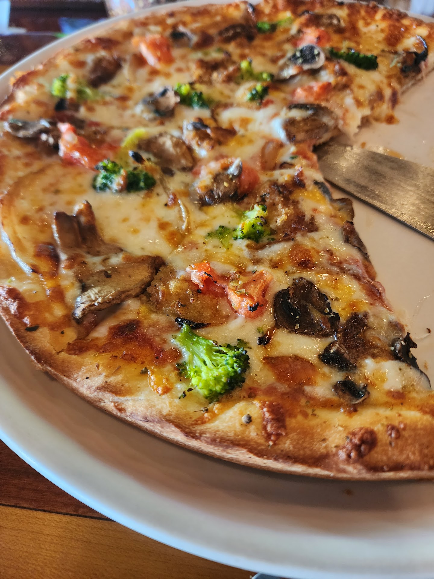 Stopped here this past weekend. Wanted to try a place we've never been to, and this place popped up on the radar, so we figured why not try it out. We got there about quarter past 4, not realizing they had just opened at 4 pm, so it wasn't busy at all, which was nice. Sat at the bar, ordered a couple of drinks, and began checking out the menu, I was torn between the fish sandwich and their "legendary" pizza. I figured I would give the pizza a try, as the description of the fish sandwich was blah at best. (I mean, it was your absolute standard lettuce tomato on a bulky roll) Our food arrived quick and hot, which is always nice. The pizza could easily feed 2 people. The crust was light a little on the thin side, not too thin, though. It didn't really taste like a pizza dough, but it was still absolutely delicious. The toppings (all veggies) were a little on the sparse side, but not something I would have complained about to the staff. My husband ordered a steak and cheese sandwich, which he had no complaints about, said it was good. There wasn't anything to really rave about. It was...