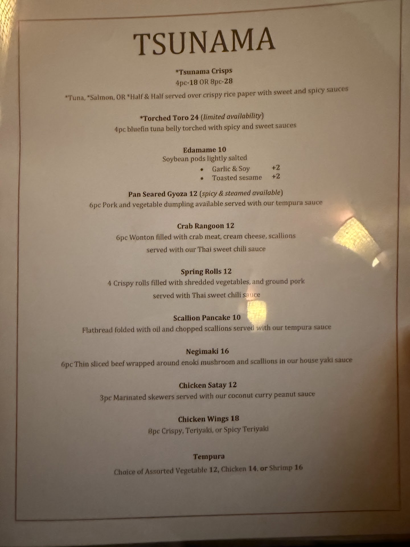 Read moreTsunama is a hidden gem in Narragansett! My wife and I had an incredible experience at this family-owned sushi spot in the Pier Marketplace. We were warmly welcomed by Fiona, who was friendly and knowledgeable. We started with the Tsunama Crispâchopped toro tuna, and chopped salmon served on a delicate rice crispâwas packed with flavor. We also enjoyed the torched toro with its sweet and slightly spicy sauce was another standout, along shrimp tempura and a variety of nigiriâescobar, mackerel, scallop, and hamachi nigiri. Everything was incredibly fresh and well-prepared.